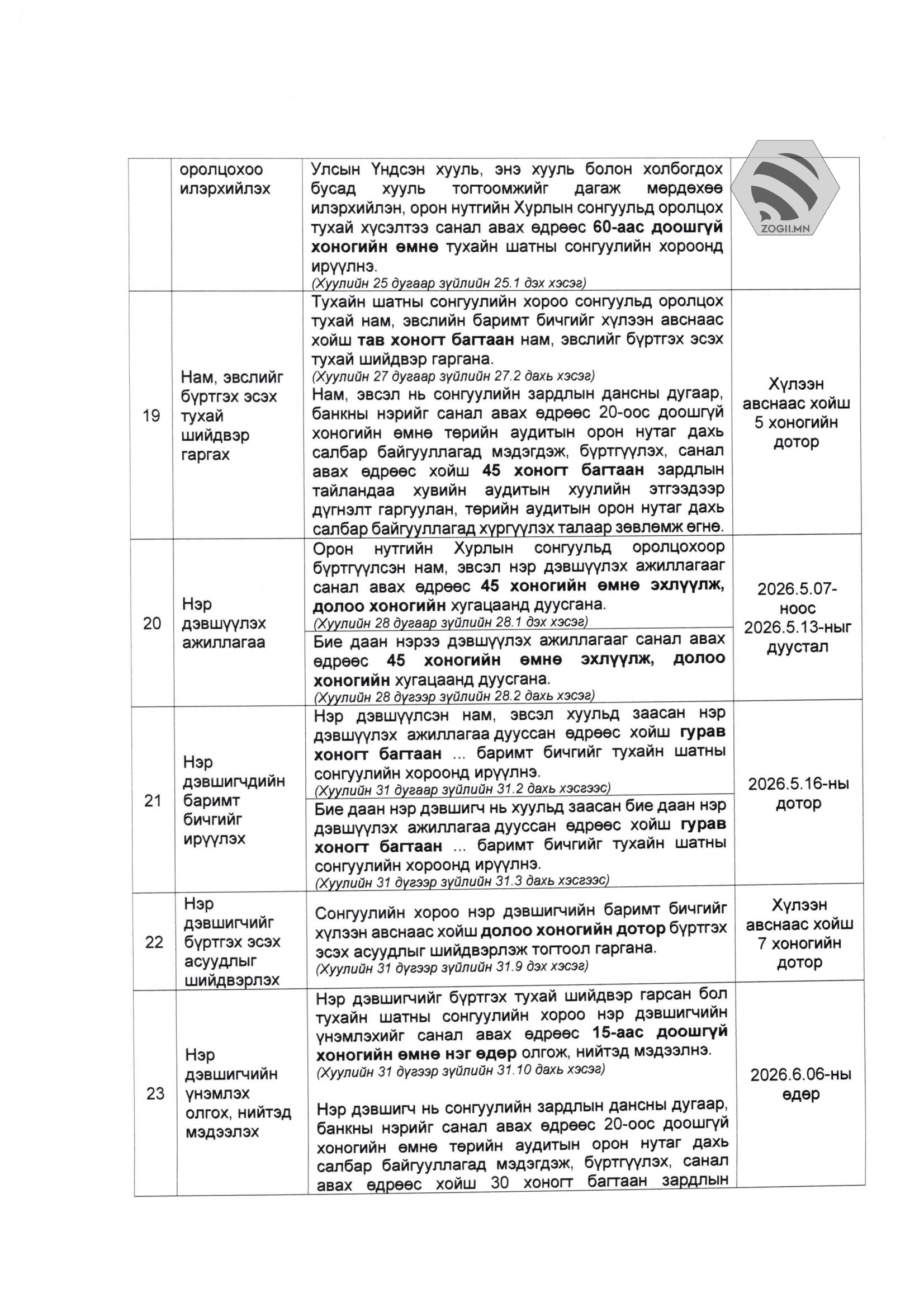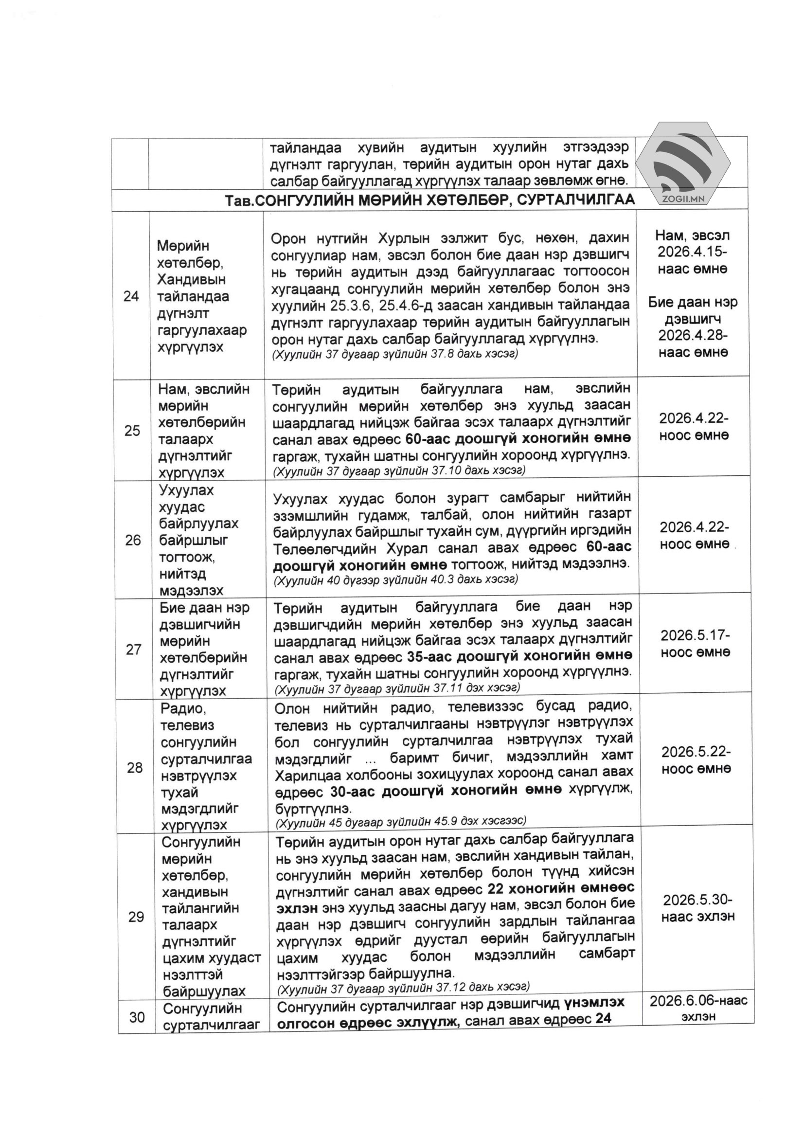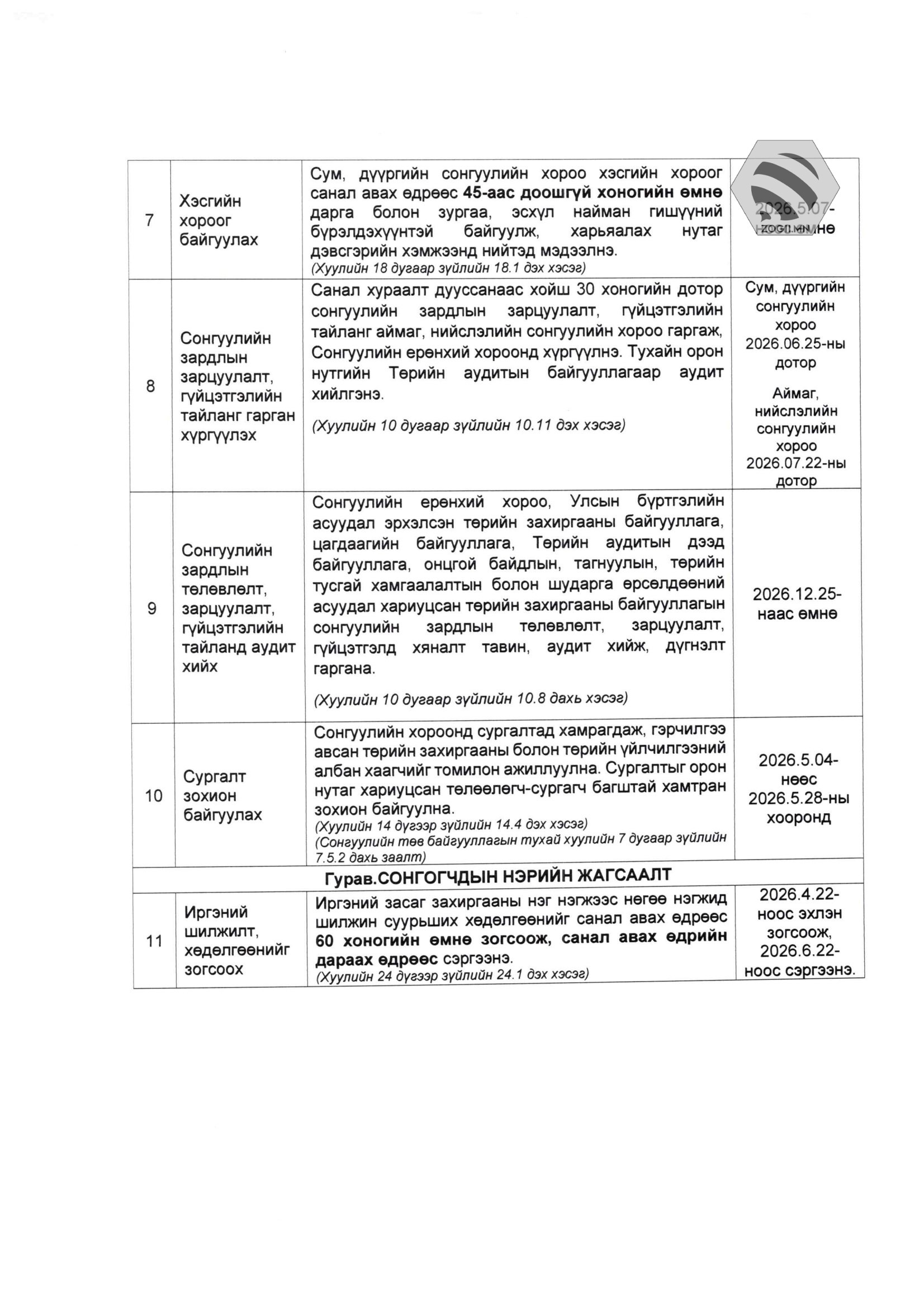 Аймаг, нийслэл, сум, дүүргийн иргэдийн Төлөөлөгчдийн Хурлын 2026 оны нөхөн сонгуулийн үйл ажиллагааг зохион байгуулах цаг хугацааны хуваарьтай танилцана уу.