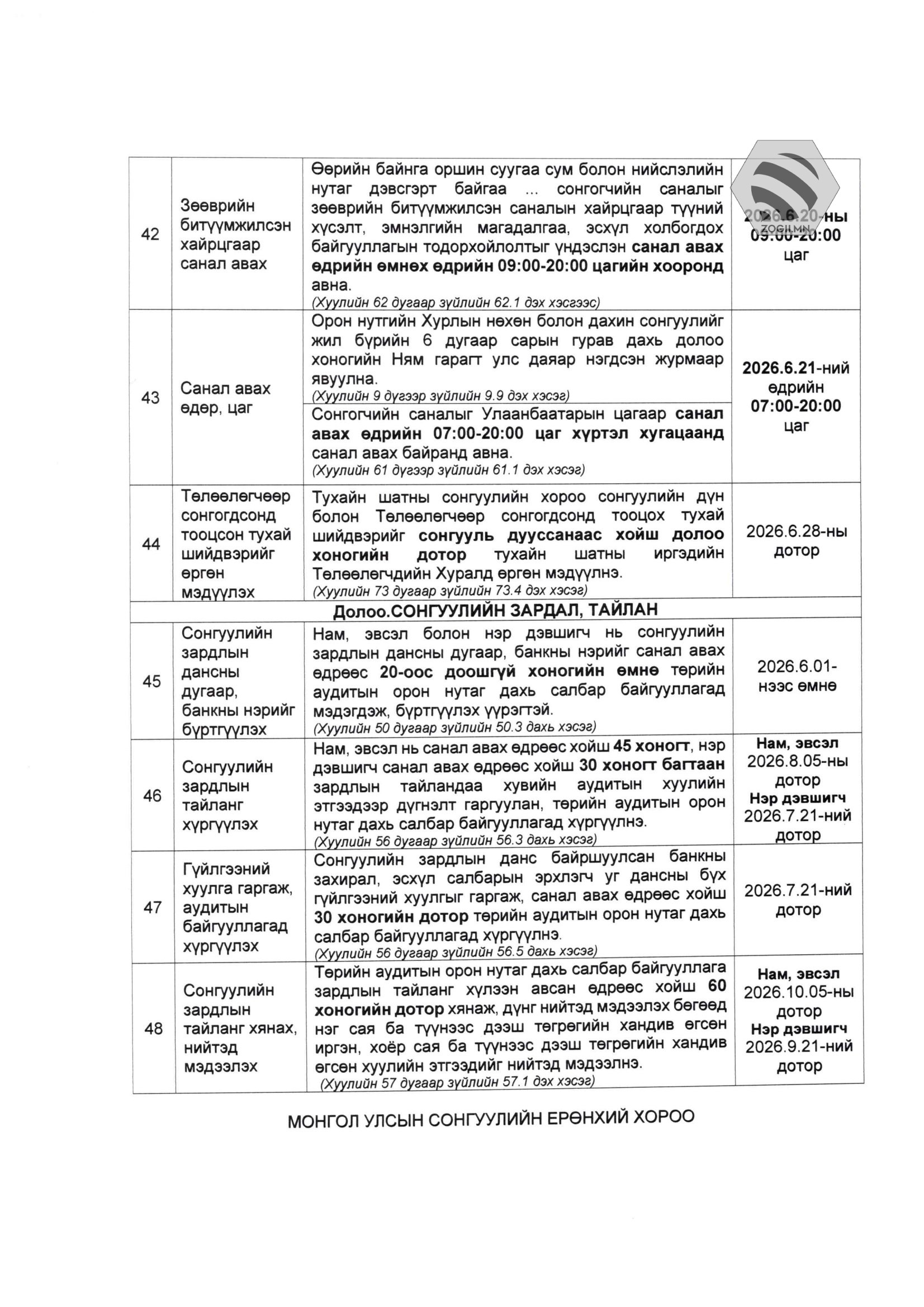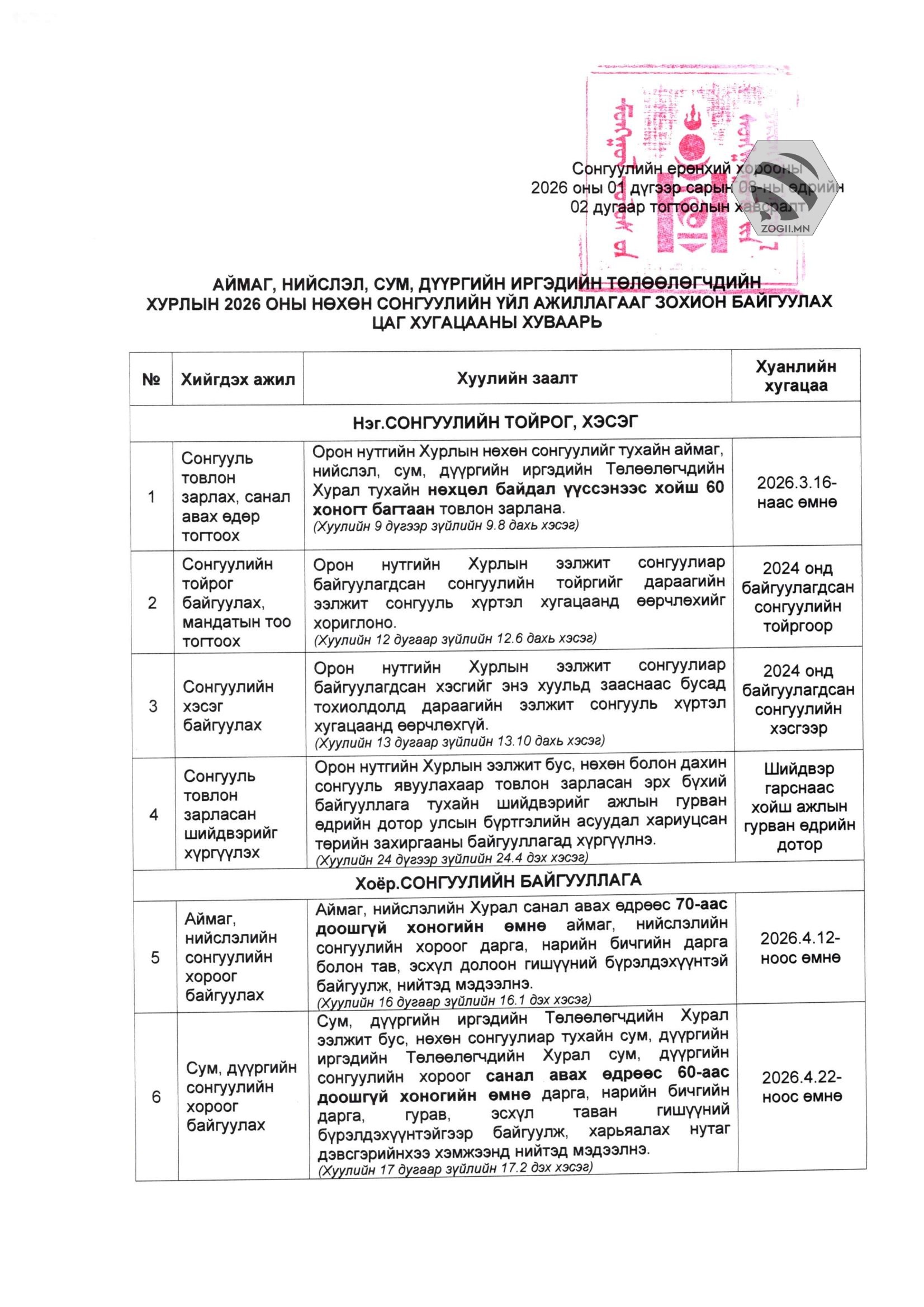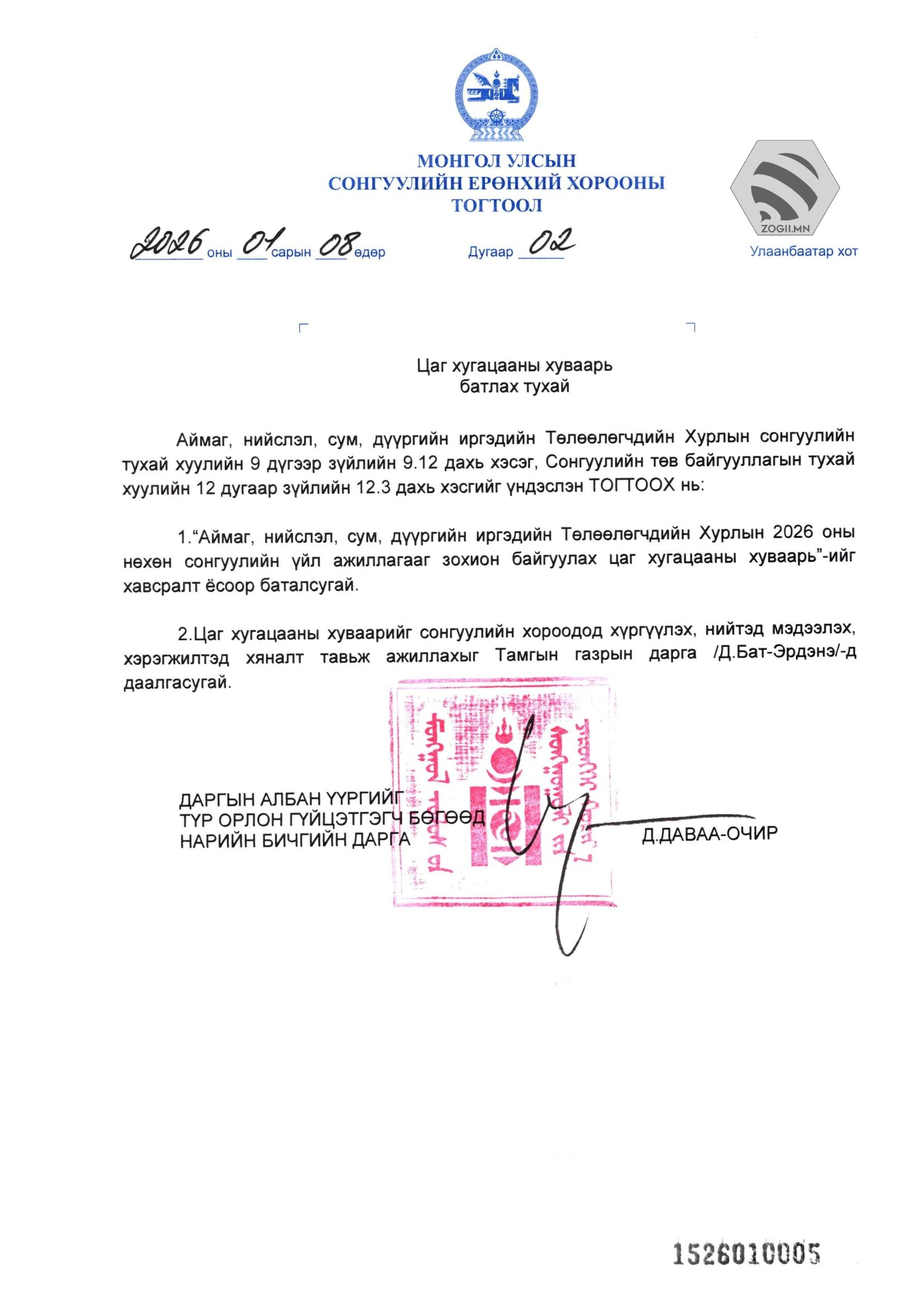 Хуульд заасны дагуу орон нутгийн Хурлын нөхөн сонгуулийг тухайн аймаг, нийслэл, сум, дүүргийн иргэдийн Төлөөлөгчдийн Хурал 2026 оны 3 дугаар сарын 16-аас өмнө товлон зарлана.