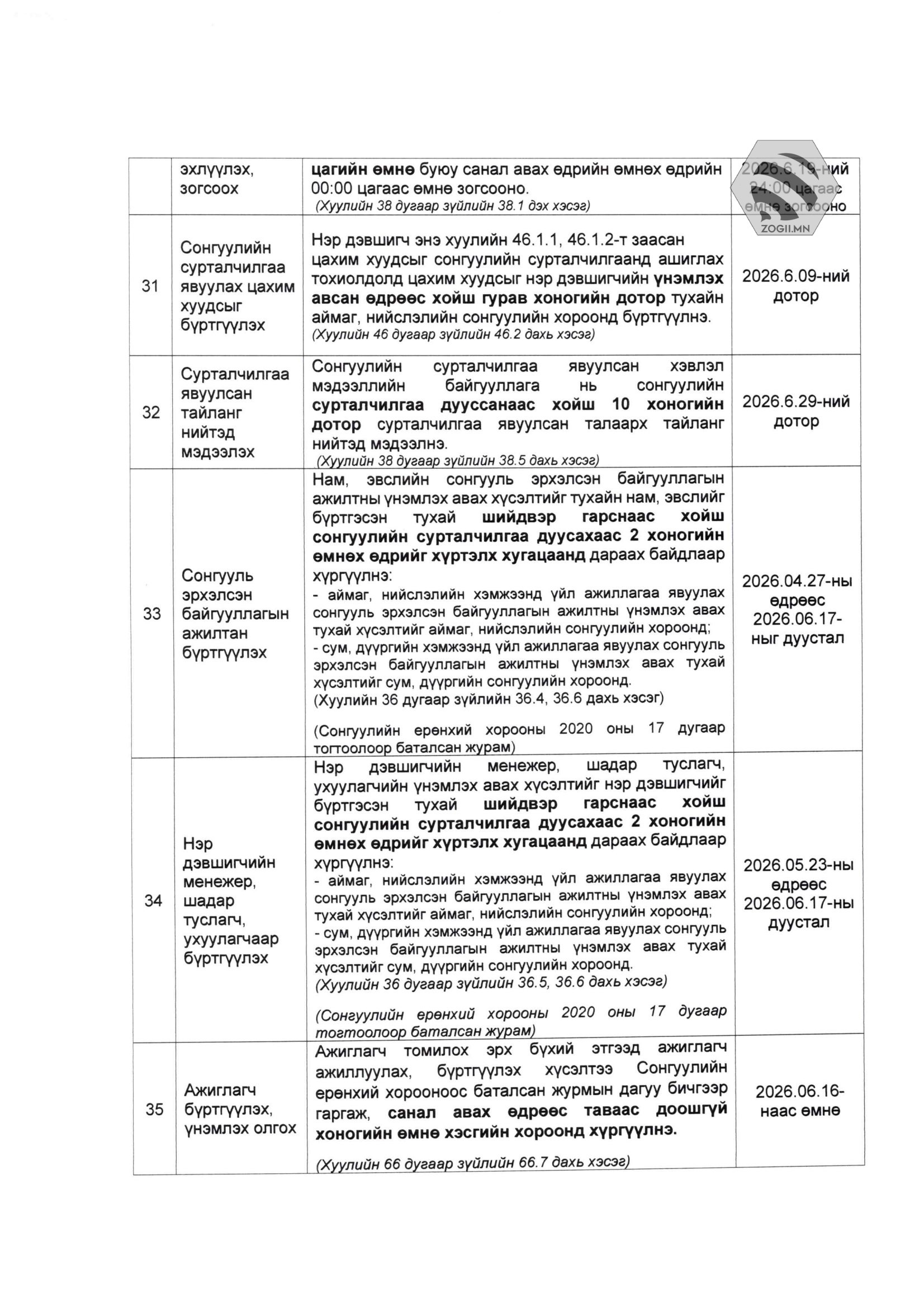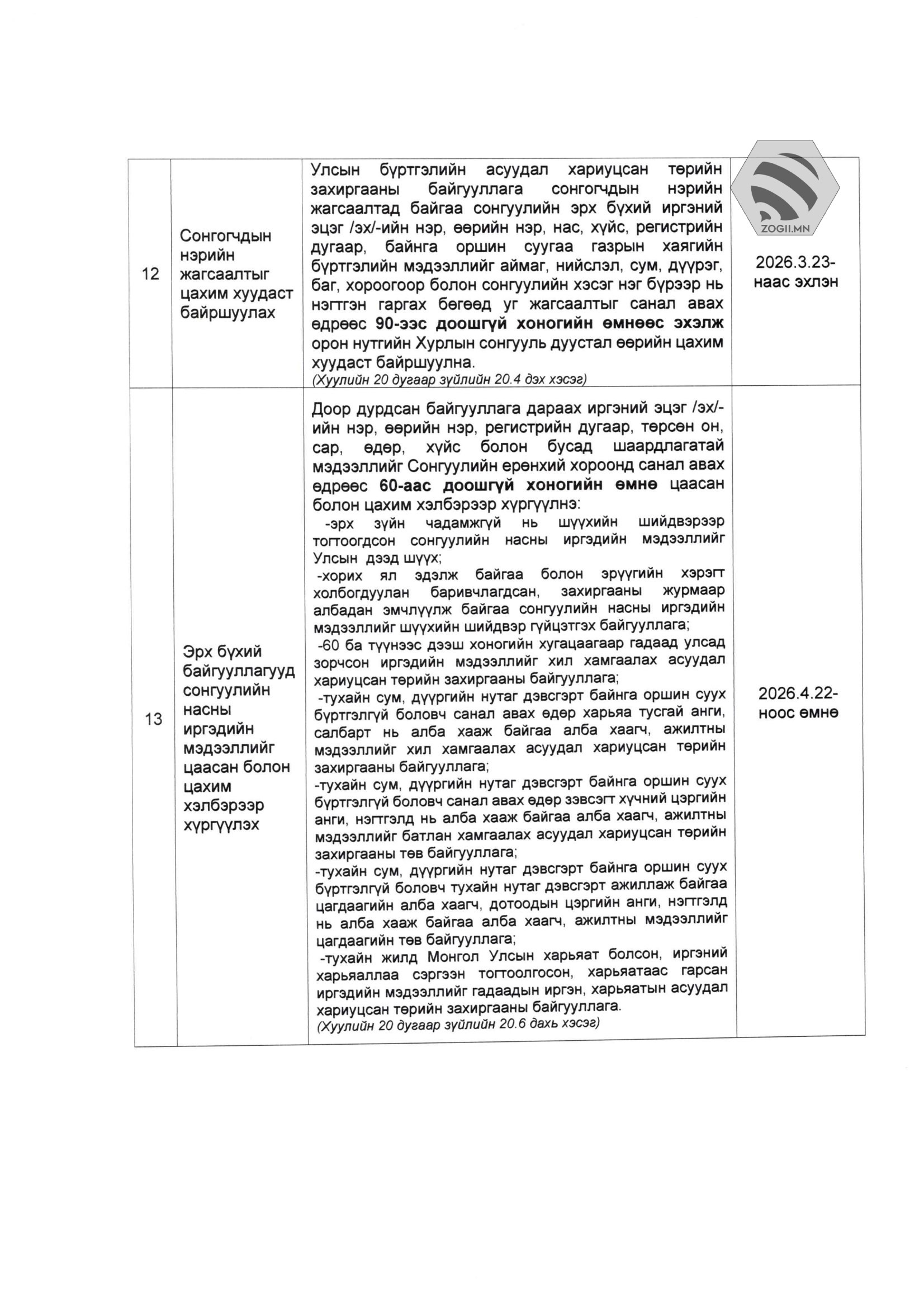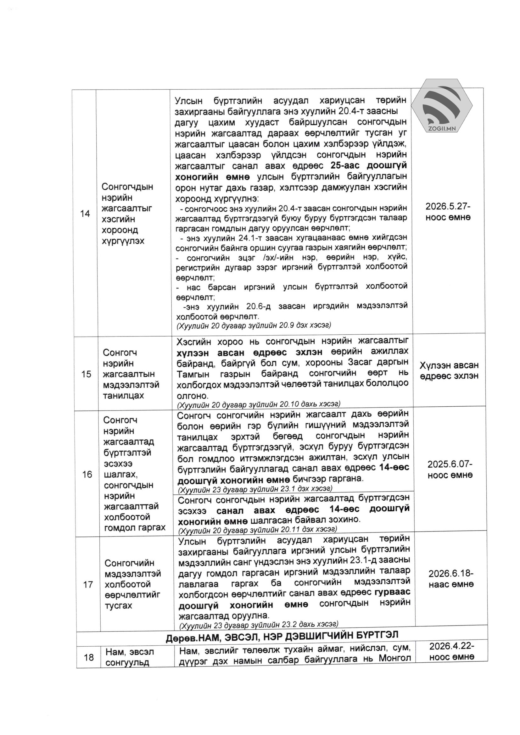 Хуульд заасны дагуу орон нутгийн Хурлын нөхөн сонгуулийг тухайн аймаг, нийслэл, сум, дүүргийн иргэдийн Төлөөлөгчдийн Хурал 2026 оны 3 дугаар сарын 16-аас өмнө товлон зарлана.