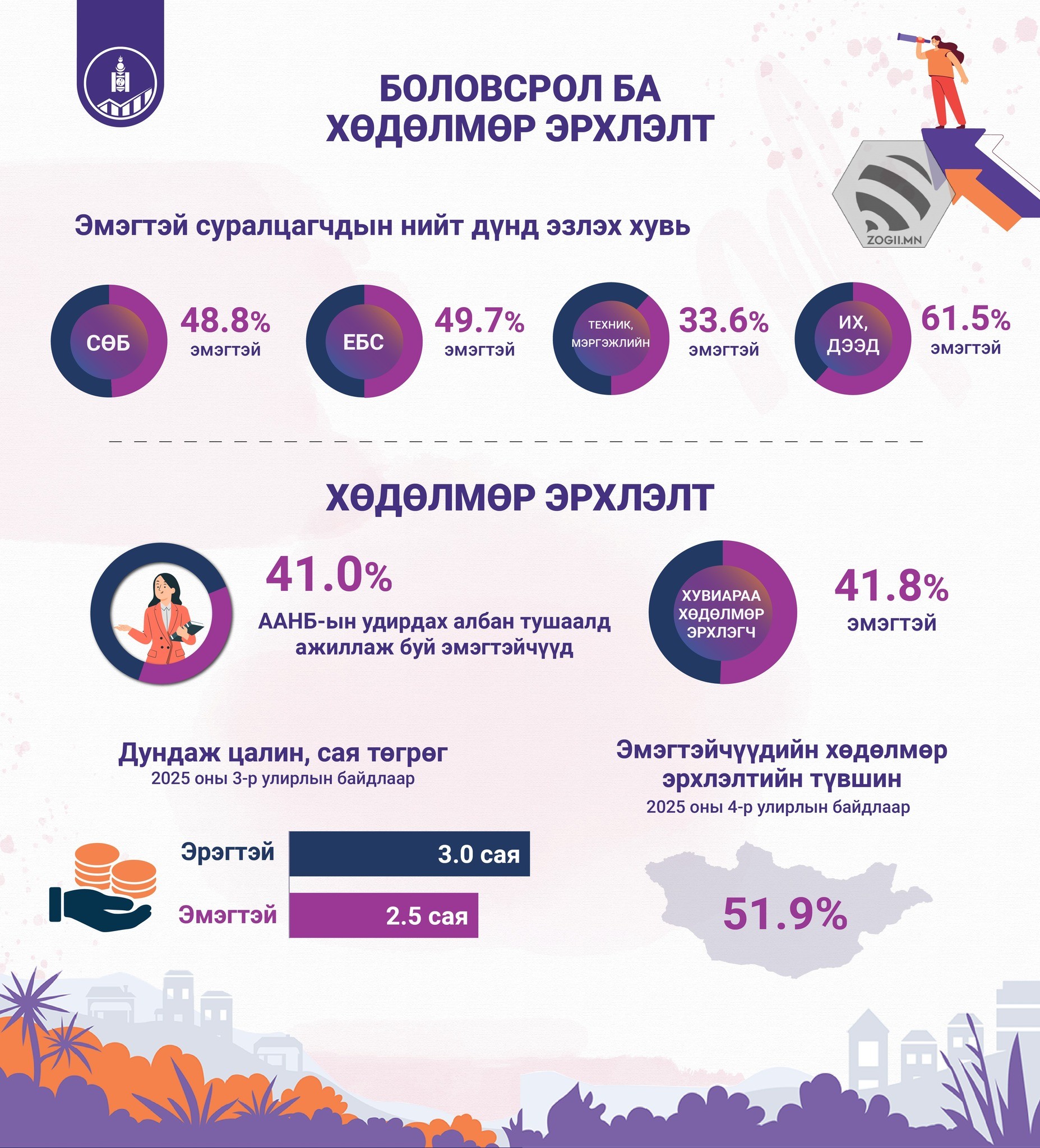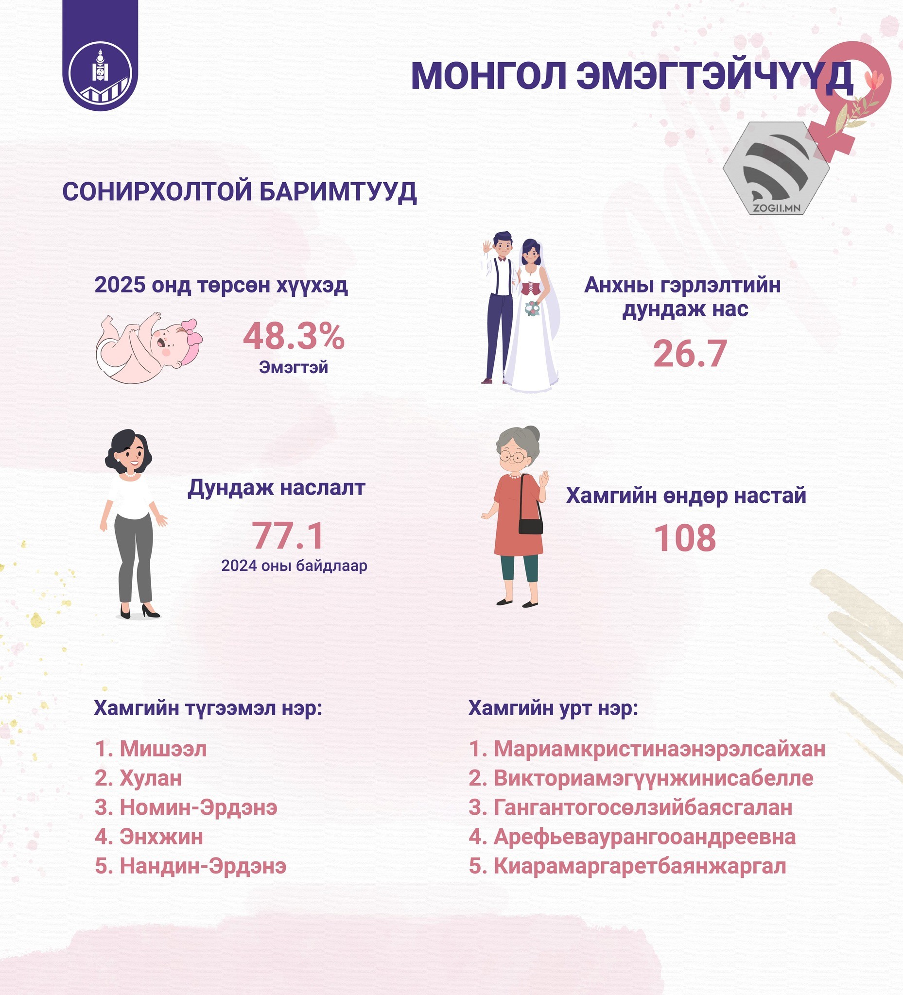 Эдгээр тоон үзүүлэлтүүд нь Монгол эмэгтэйчүүдийн амьдрал зөвхөн гэр бүл, уламжлалт үүргээр хязгаарлагдалгүй, боловсрол, ажил хөдөлмөр, нийгмийн оролцоотой илүү нягт холбоотой болсныг харуулж байна. Эмэгтэйчүүд урт насалж, илүү боловсрол эзэмшиж, амьдралынхаа чухал шийдвэрүүдийг илүү бие даан гаргах болсон нь нийгмийн хөгжлийн нэг чухал үзүүлэлт юм.