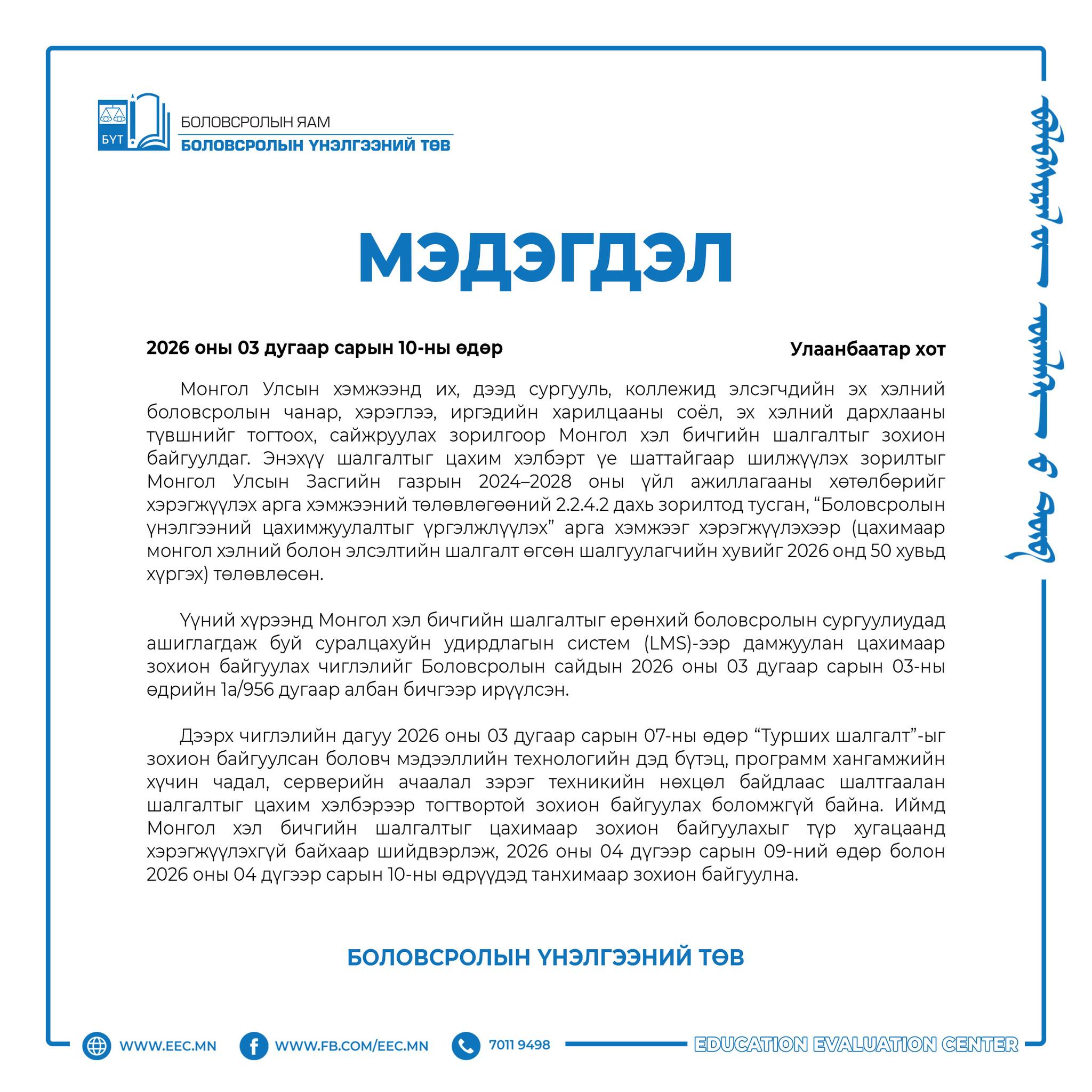 Иймд Монгол хэл бичгийн шалгалтыг цахимаар зохион байгуулах ажлыг түр хугацаанд хэрэгжүүлэхгүй байхаар шийдвэрлэж, 2026 оны дөрөвдүгээр сарын 9, 10-ны өдрүүдэд танхимаар зохион байгуулахаар боллоо.