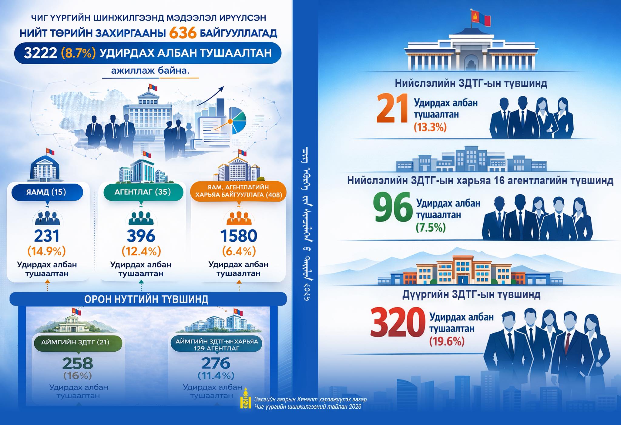 Эдгээр тоон мэдээллийг Засгийн газрын Хяналт хэрэгжүүлэх газраас гаргасан чиг үүргийн шинжилгээний 2026 оны тайланд дурдсан байна.
