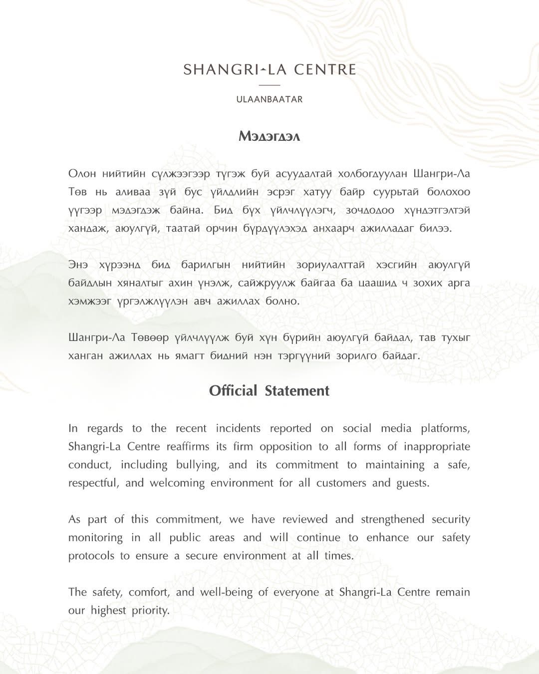 Олон нийтийн сүлжээгээр түгээж буй асуудалтай холбогдуулан Шангри-Ла Төв нь аливаа зүй бус үйлдлийн эсрэг хатуу байр суурьтай болохоо үүгээр мэдэгдэж байна. Бид бүх үйлчлүүлэгч, зочдодоо хүндэтгэлтэй хандаж, аюулгүй, таатай орчин бүрдүүлэхэд анхаарч ажилладаг билээ.