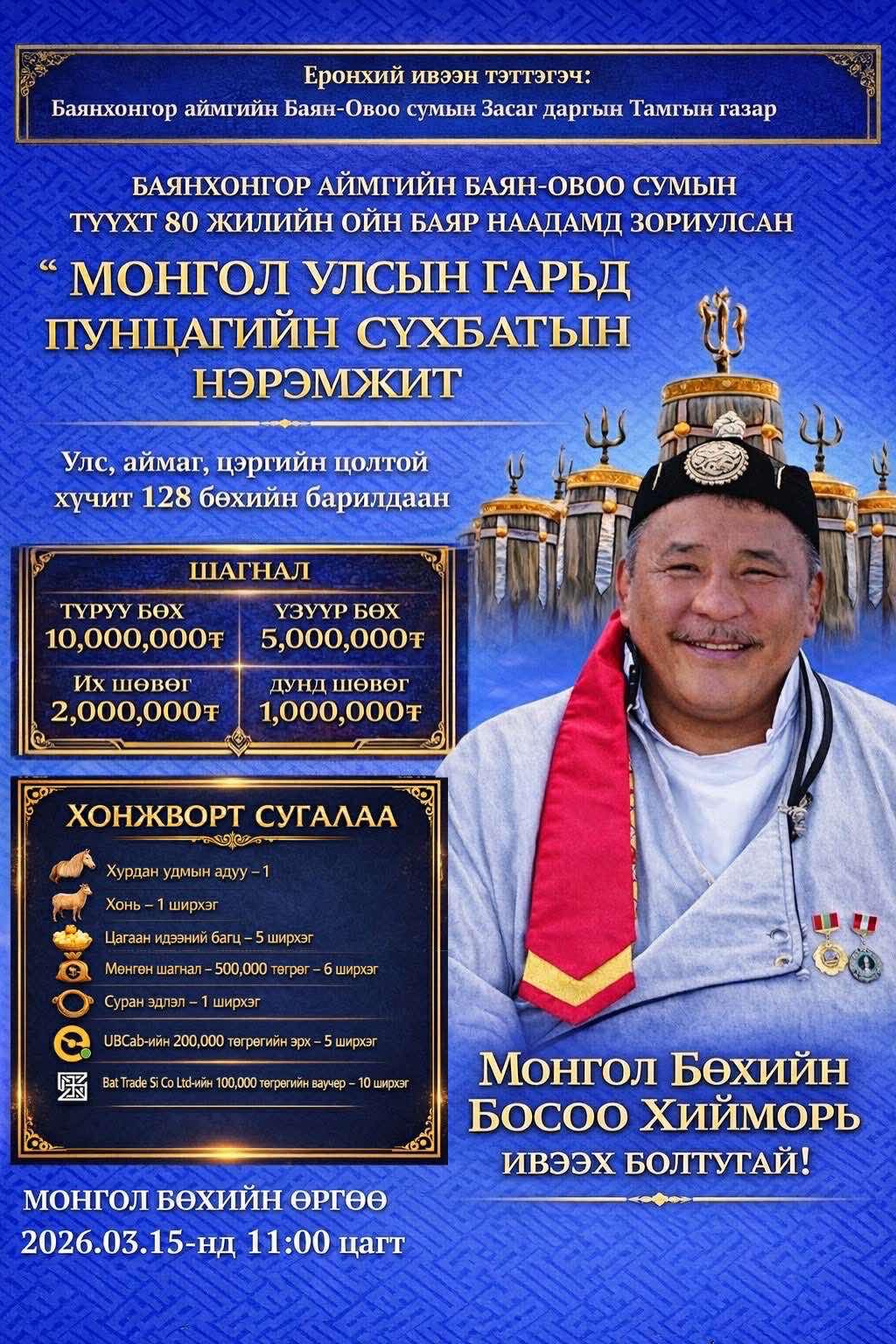 Баянхонгор аймгийн Баян-Овоо сумын түүхт 80 жилийн ойд зориулсан, тус сумын харьяат, Монгол Улсын гарди Пунцагийн Сүхбатын нэрэмжит улс, аймаг, цэрэг, сумын цолтой 128 бөхийн барилдаан гуравдугаар сарын 15-ны Ням гарагийн 13:00 цагт Монгол Бөхийн Өргөөнд болно.