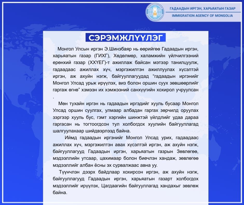 Иймд гадаадын иргэнийг Монгол Улсад урих, гадаадаас ажиллах хүч, мэргэжилтэн авах хүсэлтэй иргэн, аж ахуйн нэгж, байгууллагууд Гадаадын иргэн, харьяатын газрын Зөвлөгөө, мэдээллийн утсаар, цахимаар болон биечлэн хандаж, зөвлөгөө мэдээллийг албан ёсны эх сурвалжаас авна уу.
