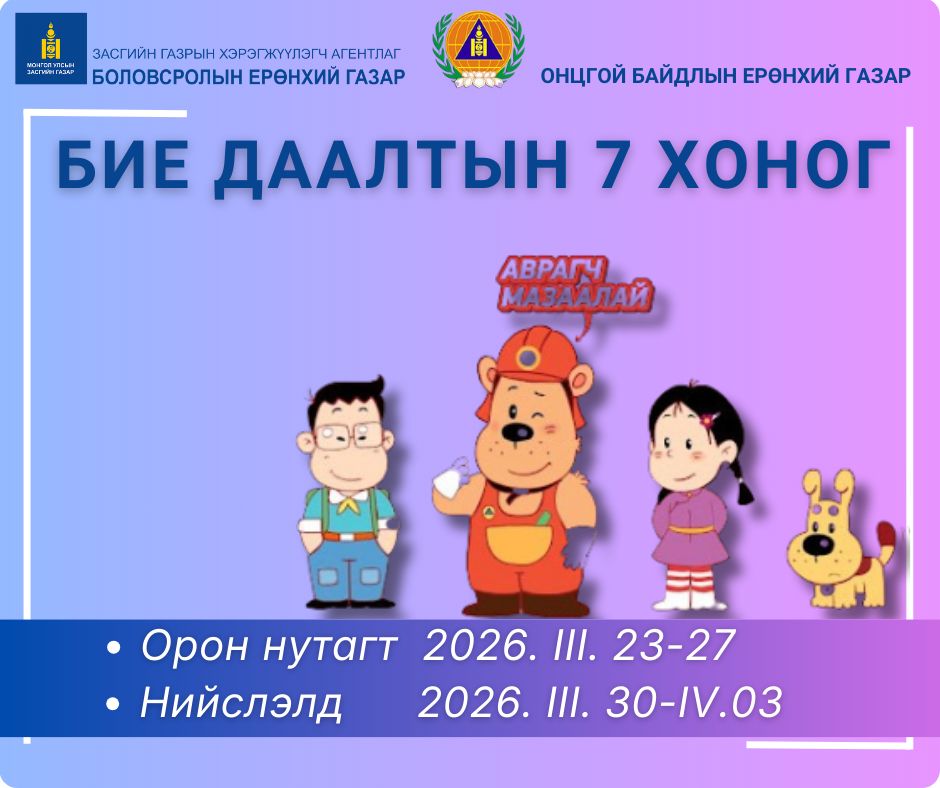 Бие даалтын 7 хоногийг орон нутагт 2026 оны 03 дугаар сарын 23-27-ны өдрүүдэд, нийслэлд 2026 оны 03 дугаар сарын 30-аас 04 дүгээр сарын 03-ны өдрүүдэд зохион байгуулна.