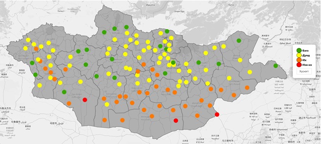 - Дунд зэргийн эрсдэлтэй: Ой, хээрийн бүс нутаг болох Хөвсгөл, Архангай, Булган, Дархан-Уул, Сэлэнгэ, Төв, Хэнтий, Дорнод аймгуудын нутгаар эрсдэлийн зэрэг дунд түвшинд байна.