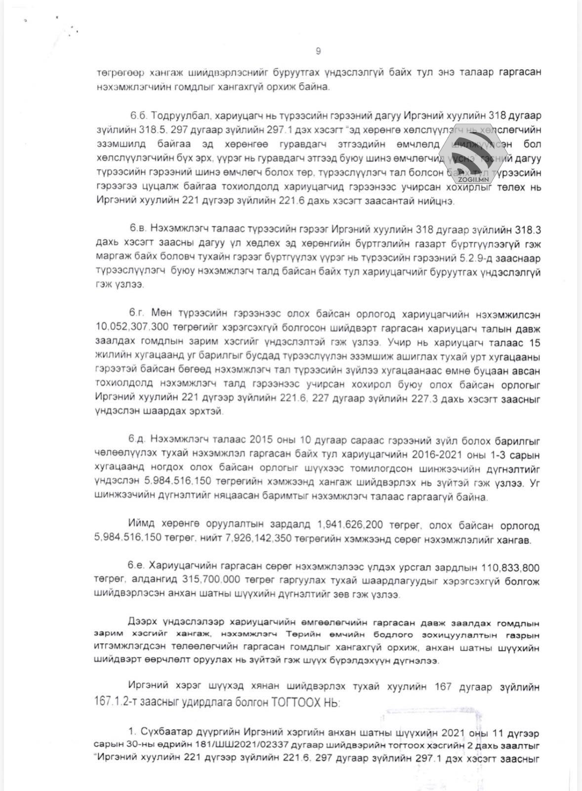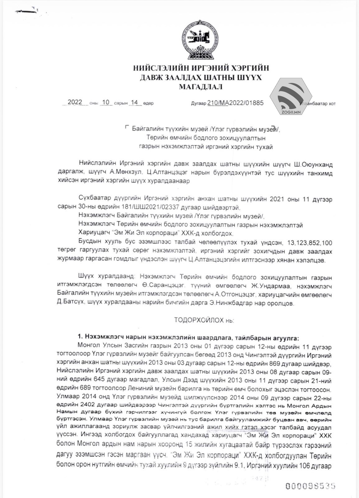 Нийслэлийн Иргэний хэргийн давж заалдах шатны шүүхийн 2022 оны 10 дугаар сарын 14-ний өдрийн 1885 дугаар магадлалаар Төрийн өмчийн бодлого, зохицуулалтын газраас 7.9 тэрбум төгрөгийг гаргуулж “Эм жи эл корпораци” ХХК-д олгохоор шийдвэрлэсэн бөгөөд Төрийн өмчийн бодлого, зохицуулалтын газрын хяналтын журмаар гаргасан гомдлыг Улсын Дээд Шүүхийн 2022 оны 12 дугаар сарын 02-ны өдрийн 001/ШХТ2022/01359 дүгээр тогтоолоор хянан хэлэлцэхээс татгалзсанаар Нийслэлийн Иргэний хэргийн давж заалдах шатны шүүхийн дээрх магадлал хуулийн хүчин төгөлдөр болсон.