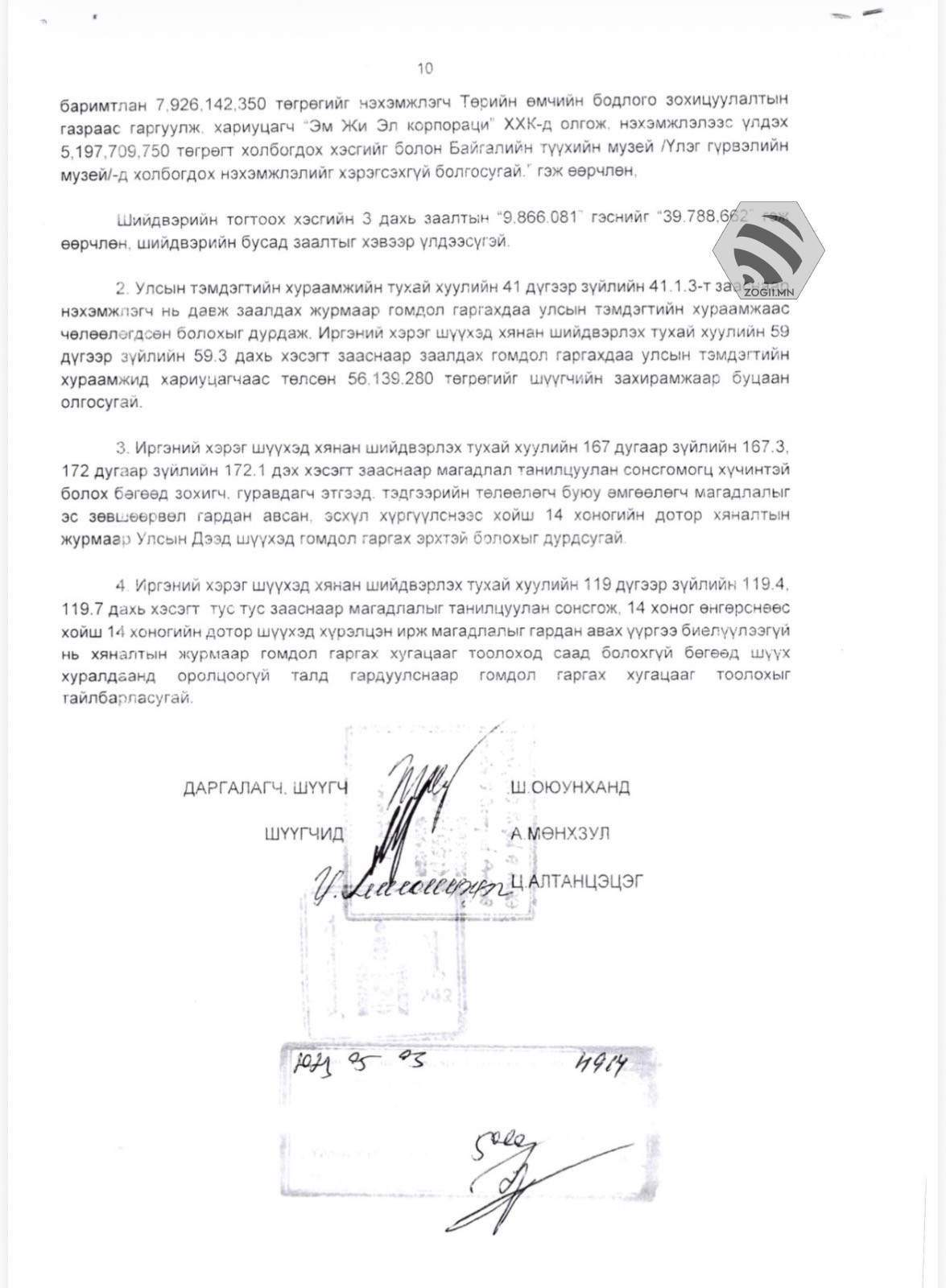 Шүүхийн шийдвэрийн дагуу “Эм жи эл корпораци” ХХК-ийн гэрээний зүйл болох барилгад хийж байсан засан сайжруулалт, засварын ажлыг зогсоож, уг барилгыг 2015 онд Үлэг гүрвэлийн төв музей, Төрийн өмчийн бодлого, зохицуулалтын газарт хүлээлгэн өгсөн тул 7,926,142,350 төгрөгийг олгохоор шийдвэрлэсэн байна.