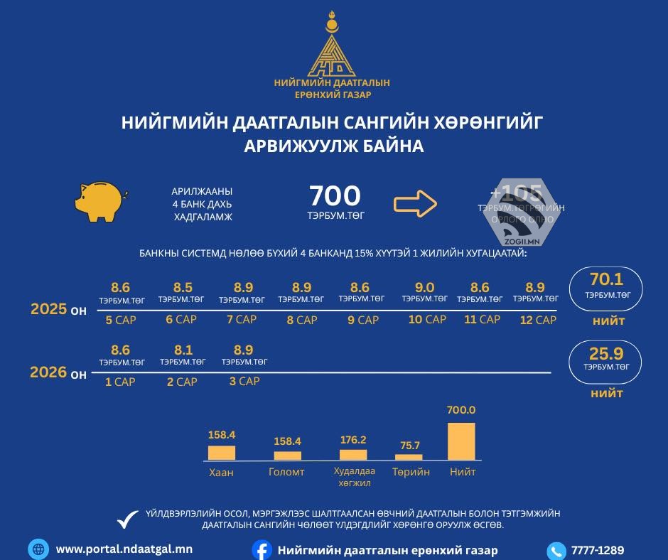 Нийгмийн даатгалын ерөнхий газар арилжааны банканд мөнгөн хадгаламж байршуулах хөрөнгийн тооцооллыг хийж Нийгмийн даатгалын үндэсний зөвлөлийн дэргэдэх орон тооны бус Мэргэжлийн хороо, Олон нийтийн хяналтын зөвлөлөөр хянуулж, 2025 оны 05 дугаар сарын 02-ны өдөр банкны системд нөлөө бүхий арилжааны 4 банканд нийгмийн даатгалын сангийн чөлөөт үлдэгдэл болох 700.0 тэрбум төгрөгийг мөнгөн хадгаламж хэлбэрээр хуваан байршуулсан.
