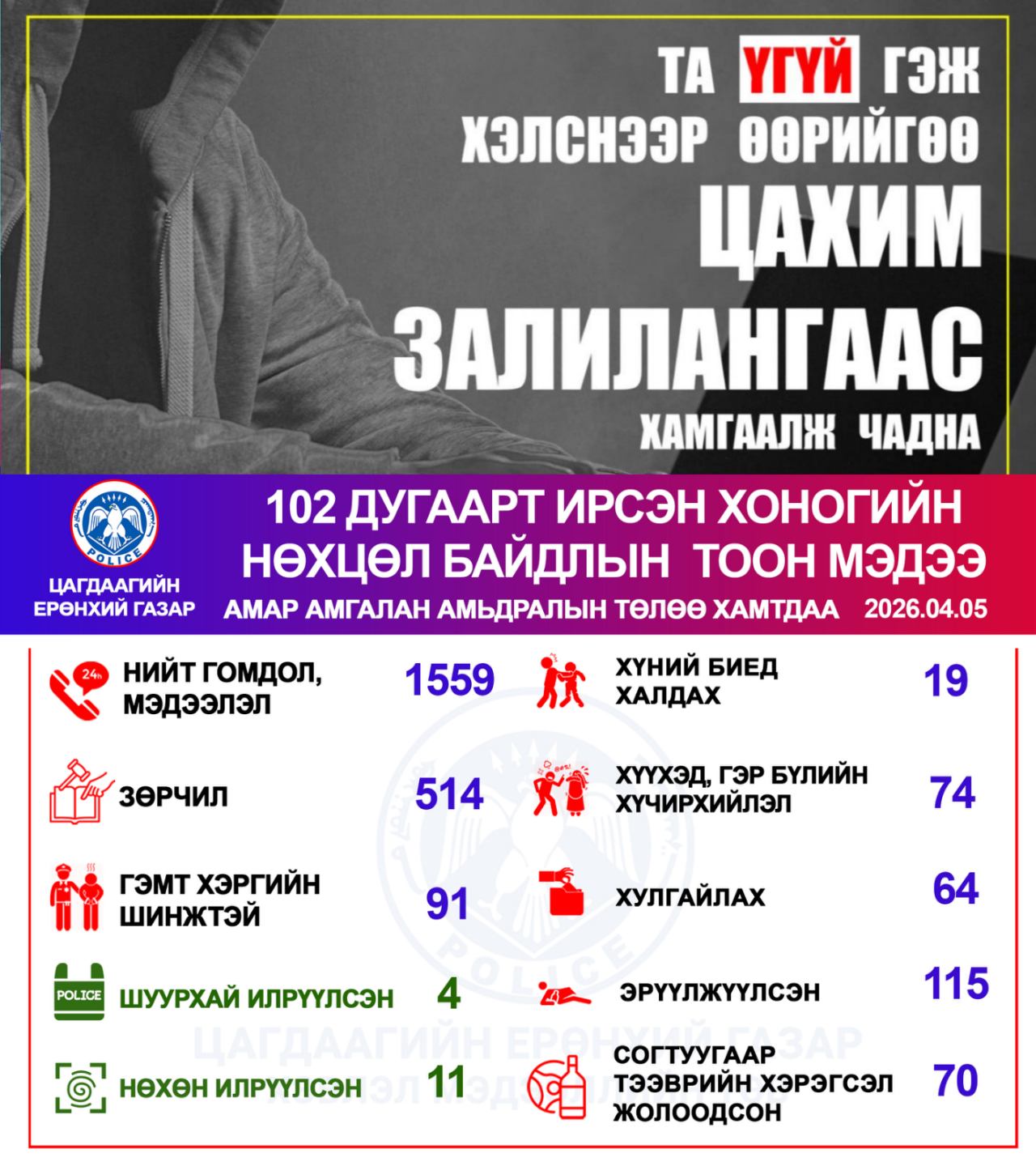 Цагдаагийн байгууллагын 102 тусгай дугаарт 2026 оны 04 дүгээр сарын 05-ны өдөр нийт 1559 дуудлага, мэдээлэл бүртгэгдсэнээс зөрчлийн шинжтэй 514, гэмт хэргийн шинжтэй 91 дуудлага, мэдээлэл байна.