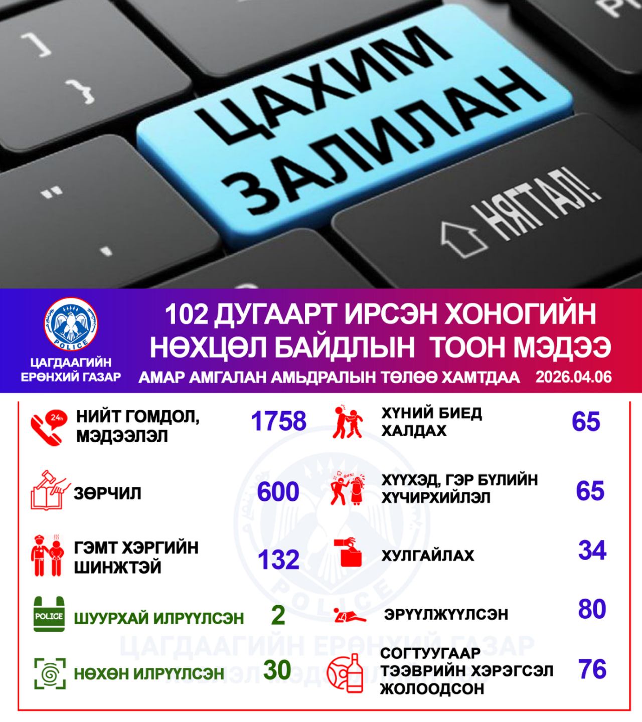 Цагдаагийн байгууллагын 102 тусгай дугаарт 2026 оны 04 дүгээр сарын 06-ны өдөр нийт 1758 дуудлага, мэдээлэл бүртгэгдсэнээс зөрчлийн шинжтэй 600, гэмт хэргийн шинжтэй 132 дуудлага, мэдээлэл байна.