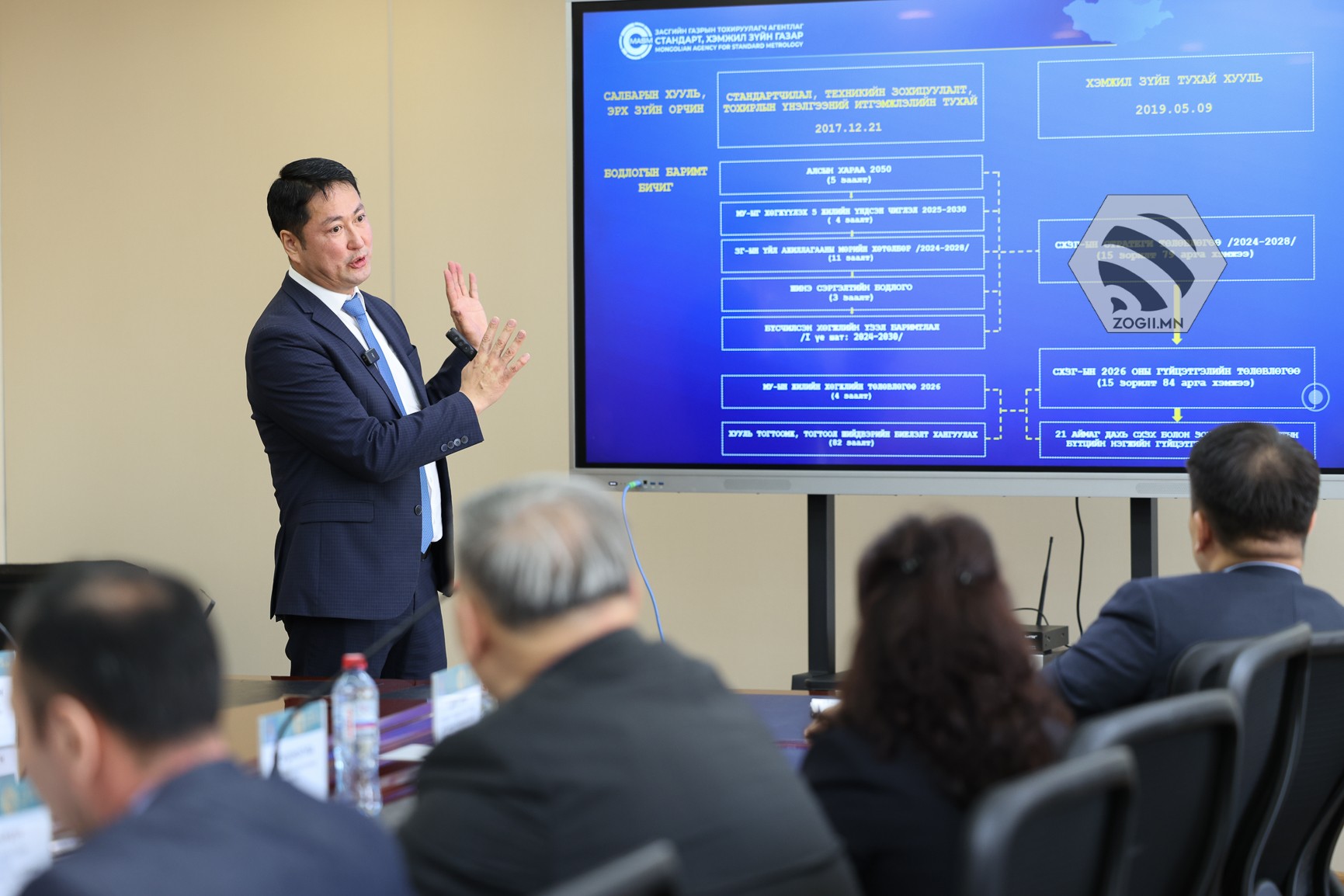 Уулзалтын эхэнд Стандарт, хэмжил зүйн газрын дарга С.Батбаатар "Стандартчилал, хэмжил зүйн салбарын бодлого, үйл ажиллагаа хуулийн шинэчилсэн найруулгын төслийг боловсруулж байгаа талаар танилцуулга мэдээлэл өгөв.