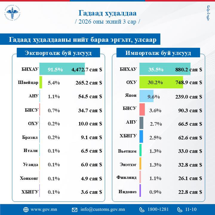 Энэ оны эхний 3 сарын дүнгээр гадаад худалдааны нийт бараа эргэлт 7366.3 сая ам.доллар болж 2025 оны мөн үеэс 1805.3 сая ам.доллар буюу 32.5 хувиар өсжээ.