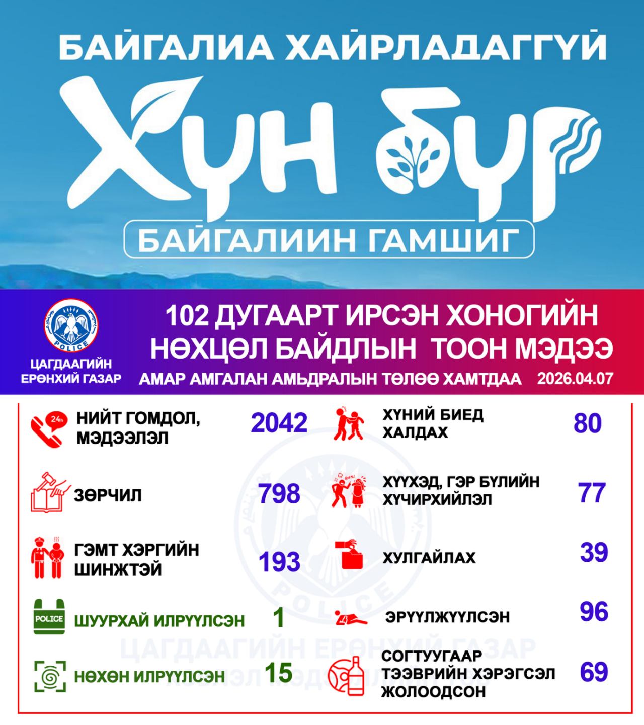 Цагдаагийн байгууллагын 102 тусгай дугаарт 2026 оны 04 дүгээр сарын 07-ны өдөр нийт 2042 дуудлага, мэдээлэл бүртгэгдсэнээс зөрчлийн шинжтэй 798, гэмт хэргийн шинжтэй 193 дуудлага, мэдээлэл байна.