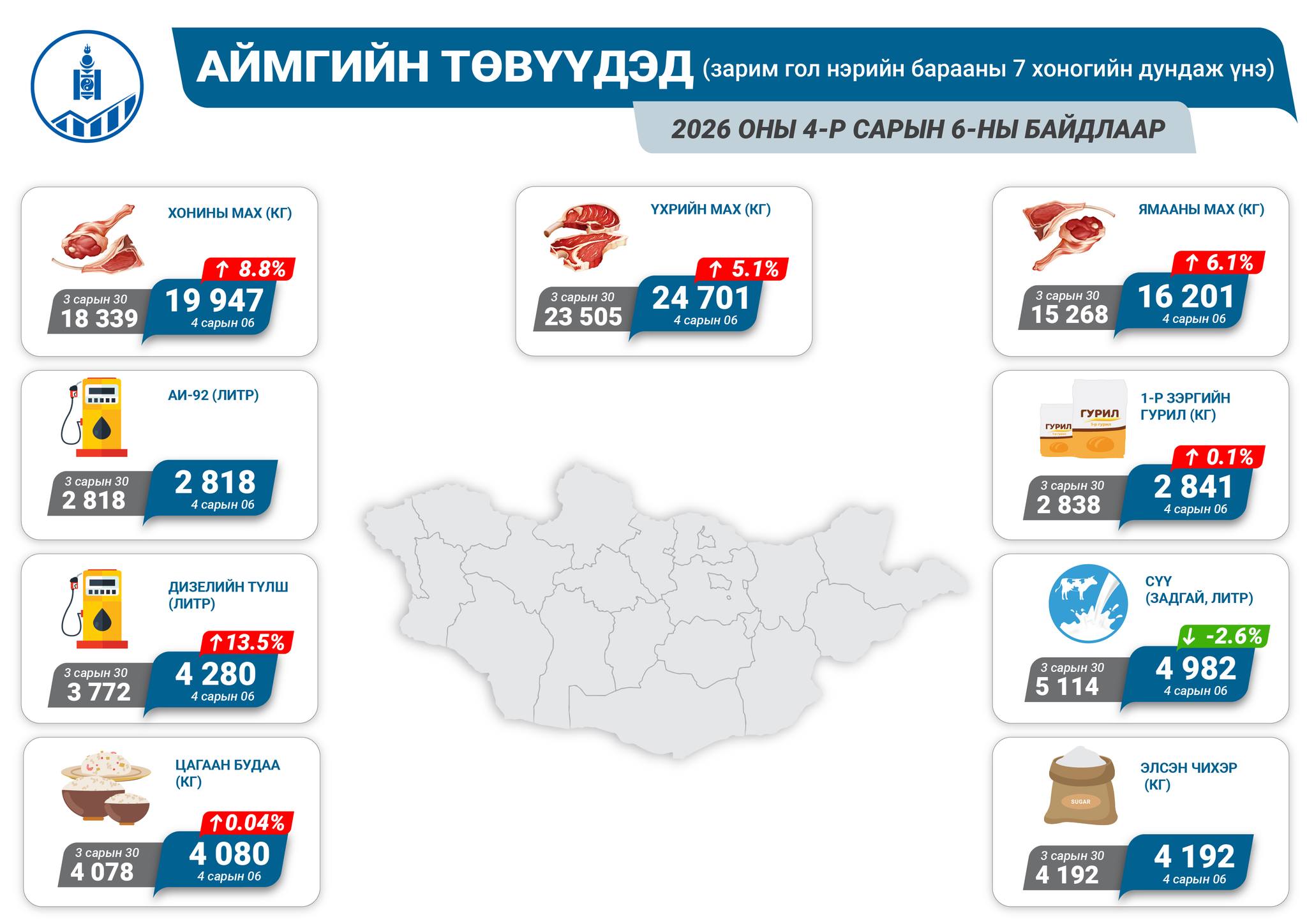 2026 оны 4 дүгээр сарын 6-ны байдлаар аймгийн төвүүдэд зарагдаж байгаа гол нэрийн зарим хүнсний барааны дундаж үнэ танилцуулж байна.