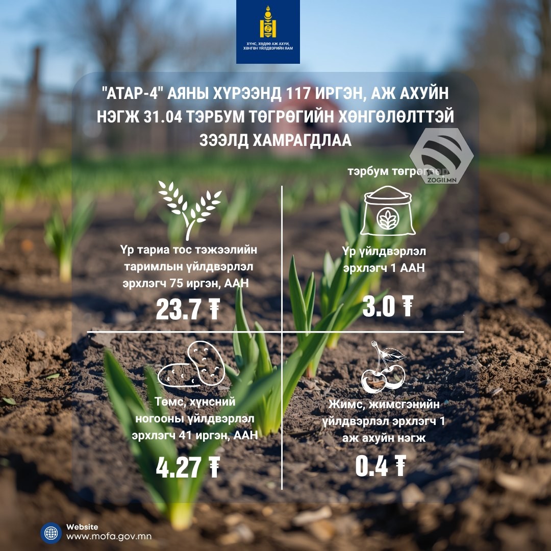 “Атар-4 тариалангийн тогтвортой хөгжлийн аян”-ы хүрээнд олгогдож буй Засгийн газраас хүүгийн дэмжлэг үзүүлж буй тариалангийн үйлдвэрлэлийг дэмжих эргэлтийн хөрөнгийн зээлд 2026 оны 4 дүгээр сарын 9-ний өдрийн байдлаар нийт 117 иргэн, аж ахуйн нэгж хамрагдаж, 31.04 тэрбум төгрөгийн хөнгөлөлттэй зээлийг арилжааны банкнуудаас аваад байна.