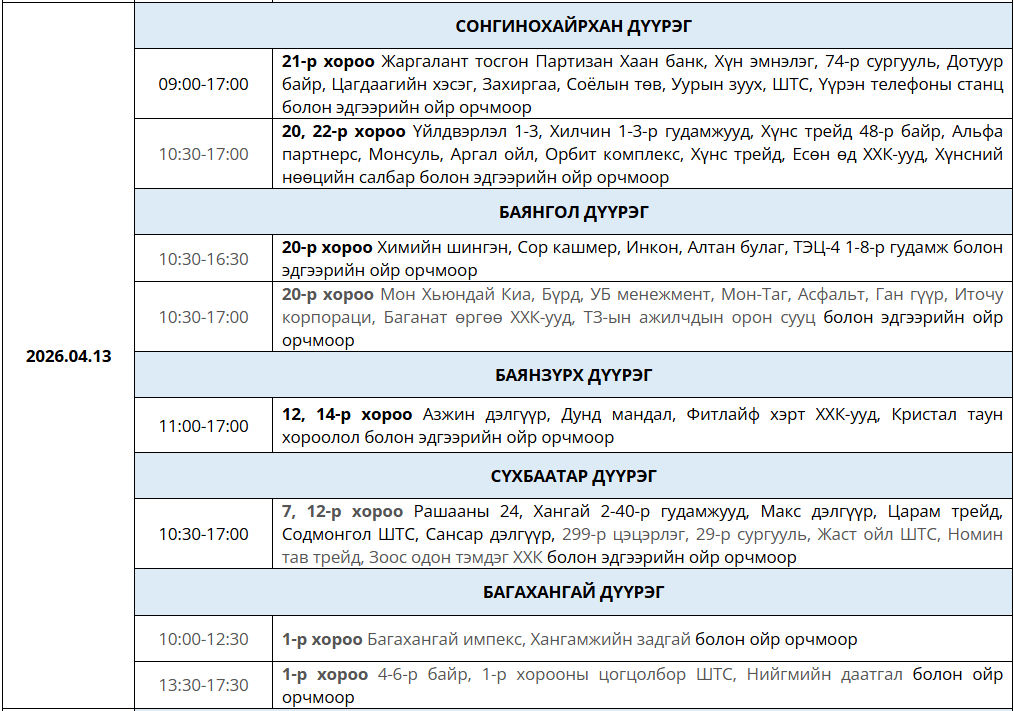 Маргааш буюу дөрөвдүгээр сарын 13-ны өдөр цахилгаан шугам тоноглолд засвар үйлчилгаа хийх хуваарийг танилцуулж байна.