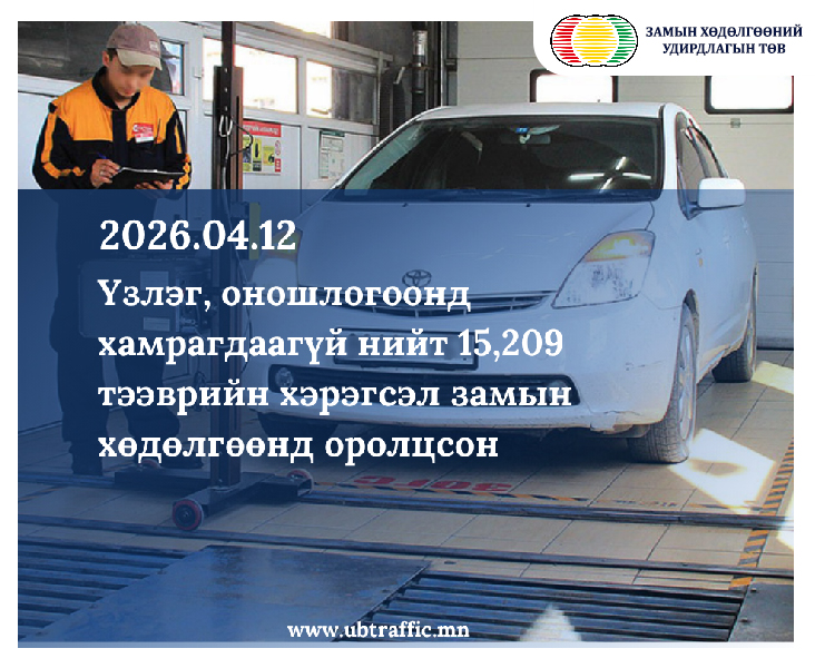 2026 оны 04 дүгээр сарын 12-ны өдөр Улаанбаатар хотод үзлэг, оношилгоонд хамрагдаагүй 15,209 тээврийн хэрэгсэл замын хөдөлгөөнд оролцсон нь бүртгэгдлээ.