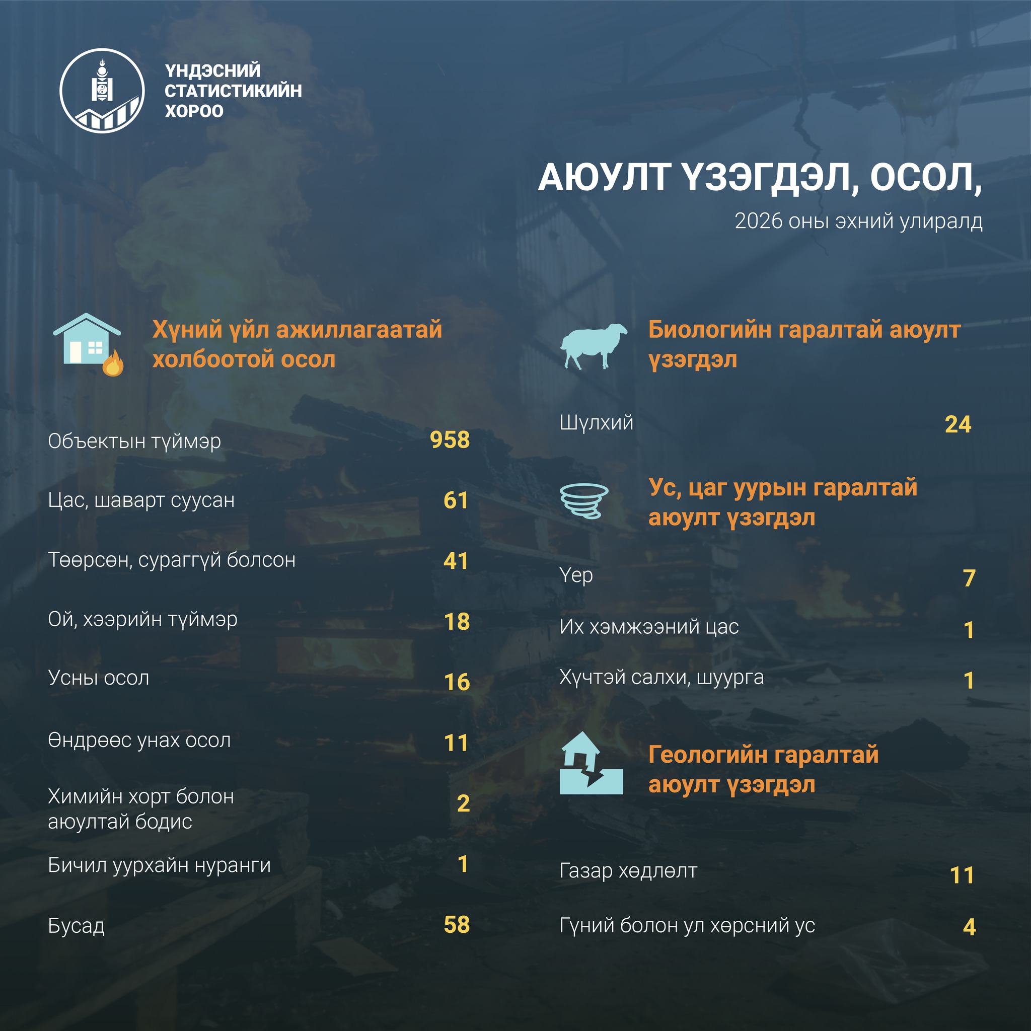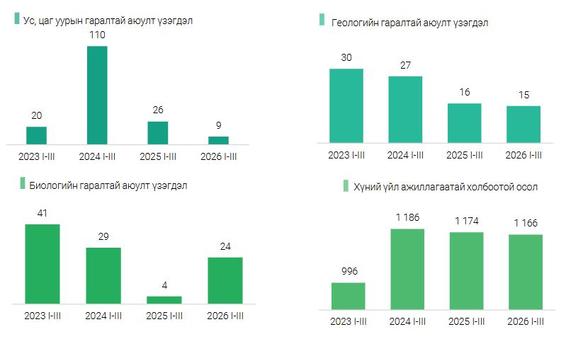 2026 оны эхний улиралд бүртгэгдсэн нийт аюулт үзэгдэл, ослын дүнд хүний үйл ажиллагаатай холбоотой осол 1166 удаа буюу 96.0 хувийг, биологийн гаралтай аюулт үзэгдэл 24 удаа буюу 2.0 хувийг, геологийн гаралтай аюулт үзэгдэл 15 удаа буюу 1.2 хувийг, ус, цаг уурын гаралтай аюулт үзэгдэл 9 удаа буюу 0.7 хувийг тус тус эзэлж байна.