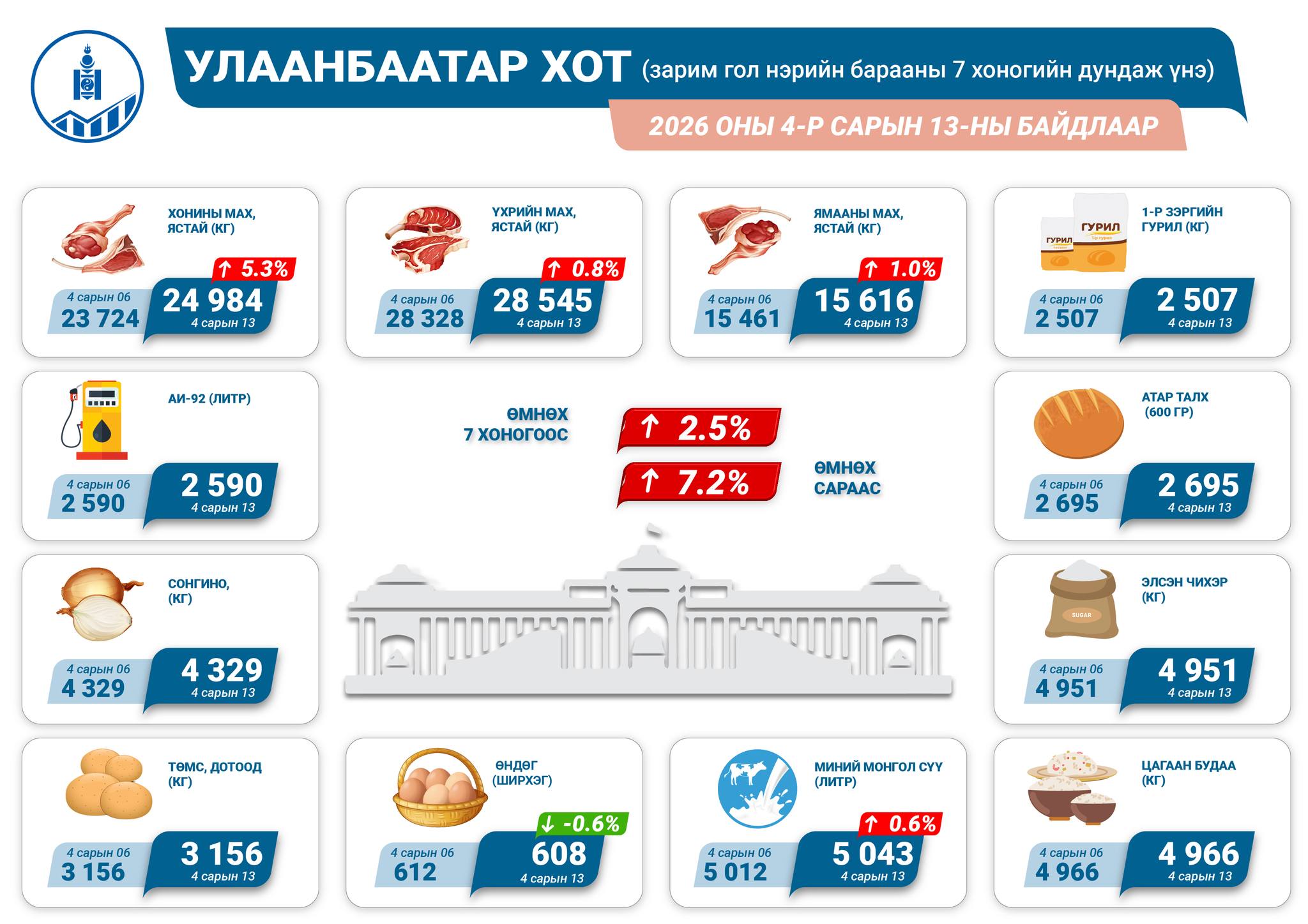 Улаанбаатар хотод 2026 оны 4 дүгээр сарын 13-ны байдлаар гол нэрийн зарим барааны үнэ өмнөх сараас 7.2 хувь, өмнөх 7 хоногоос 2.5 хувиар тус тус өссөн байна.