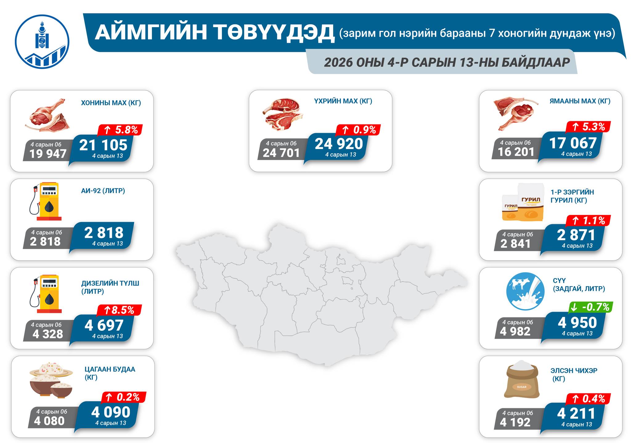 2026 оны 4 дүгээр сарын 13-ны байдлаар аймгийн төвүүдэд зарагдаж байгаа гол нэрийн зарим хүнсний барааны дундаж үнэ танилцуулж байна.