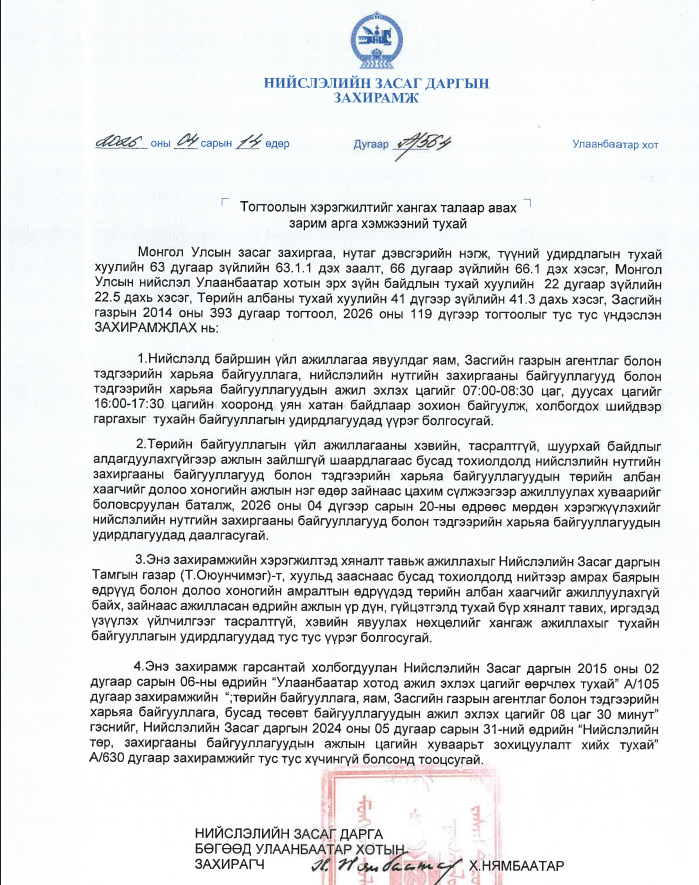 Монгол Улсын Засгийн газрын 2026 оны 4 дүгээр сарын 8-ны өдрийн ээлжит хуралдаанаар төрийн албан хаагчдыг уян хатан цагийн хуваариар ажиллах, нэг өдрийг цахимаар ажиллуулахаар шийдвэрлэсэн. Энэ хүрээнд нийслэлийн Засаг даргын А/564 тоот захирамжаар нийслэлд байршин үйл ажиллагаа явуулдаг яам, Засгийн газрын агентлаг, тэдгээрийн харьяа байгууллага, нийслэлийн нутгийн захиргааны байгууллагууд болон тэдгээрийн харьяа байгууллагуудын ажил эхлэх цагийг 07:00-08:30, дуусах цагийг 16:00-17:30 цагийн хооронд уян хатан байхаар шийдвэрлэлээ. Мөн төрийн байгууллагын үйл ажиллагааны хэвийн, тасралтгүй, шуурхай байдлыг алдагдуулахгүйгээр ажлын зайлшгүй шаардлагаас бусад тохиолдолд нийслэлийн төр, захиргааны байгууллагын албан хаагчид 2026 оны 4 дүгээр сарын 20-ны өдрөөс долоо хоногийн нэг өдөр зайнаас цахимаар ажиллана.