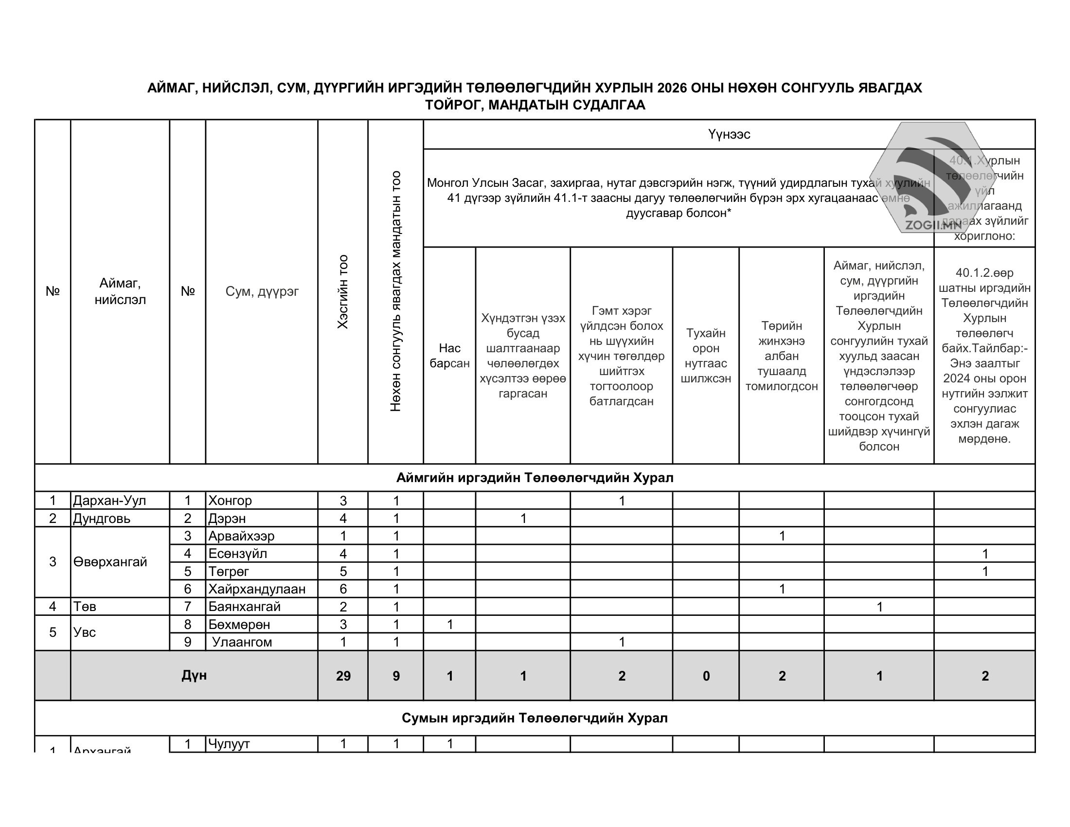 Аймаг, нийслэл, сум, дүүргийн иргэдийн Төлөөлөгчдийн Хурлын нөхөн сонгууль зохион байгуулах аймаг, сумдыг мэдээллийг хүргэж байна.