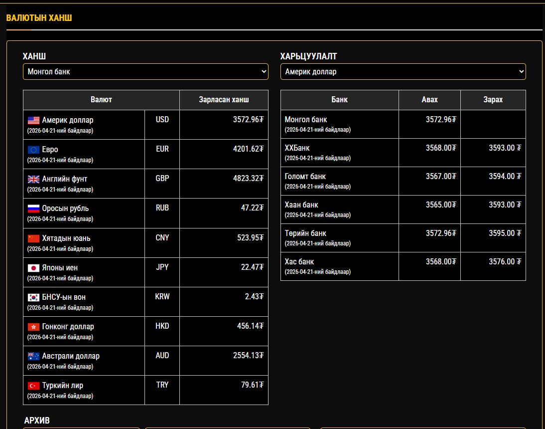 Монголбанк, Худалдаа хөгжлийн банк, Голомт банк, Хаан банк, Төрийн банк, Хас банкуудын валютын ханшийн өнөөдрийн /2026.04.21/ мэдээг танилцуулж байна.