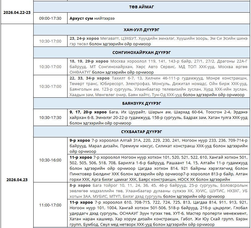 Өнөөдөр буюу дөрөвдүгээр сарын 23-ны өдөр цахилгаан шугам тоноглолд засвар үйлчилгаа хийх хуваарийг танилцуулж байна.