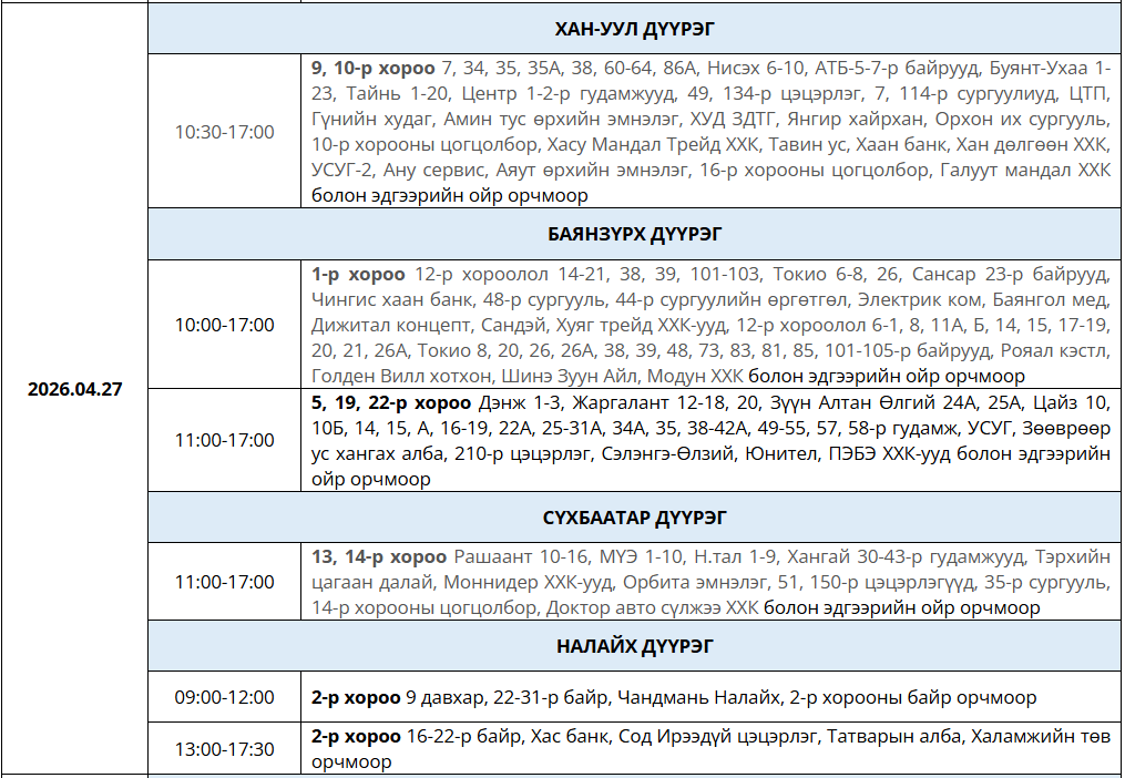 Маргааш буюу дөрөвдүгээр сарын 27-ны өдөр цахилгаан шугам тоноглолд засвар үйлчилгаа хийх хуваарийг танилцуулж байна.