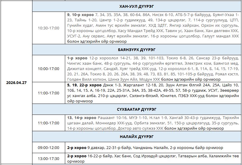 Өнөөдөр буюу дөрөвдүгээр сарын сарын 27-ны өдөр цахилгаан шугам тоноглолд засвар үйлчилгаа хийх хуваарийг танилцуулж байна.