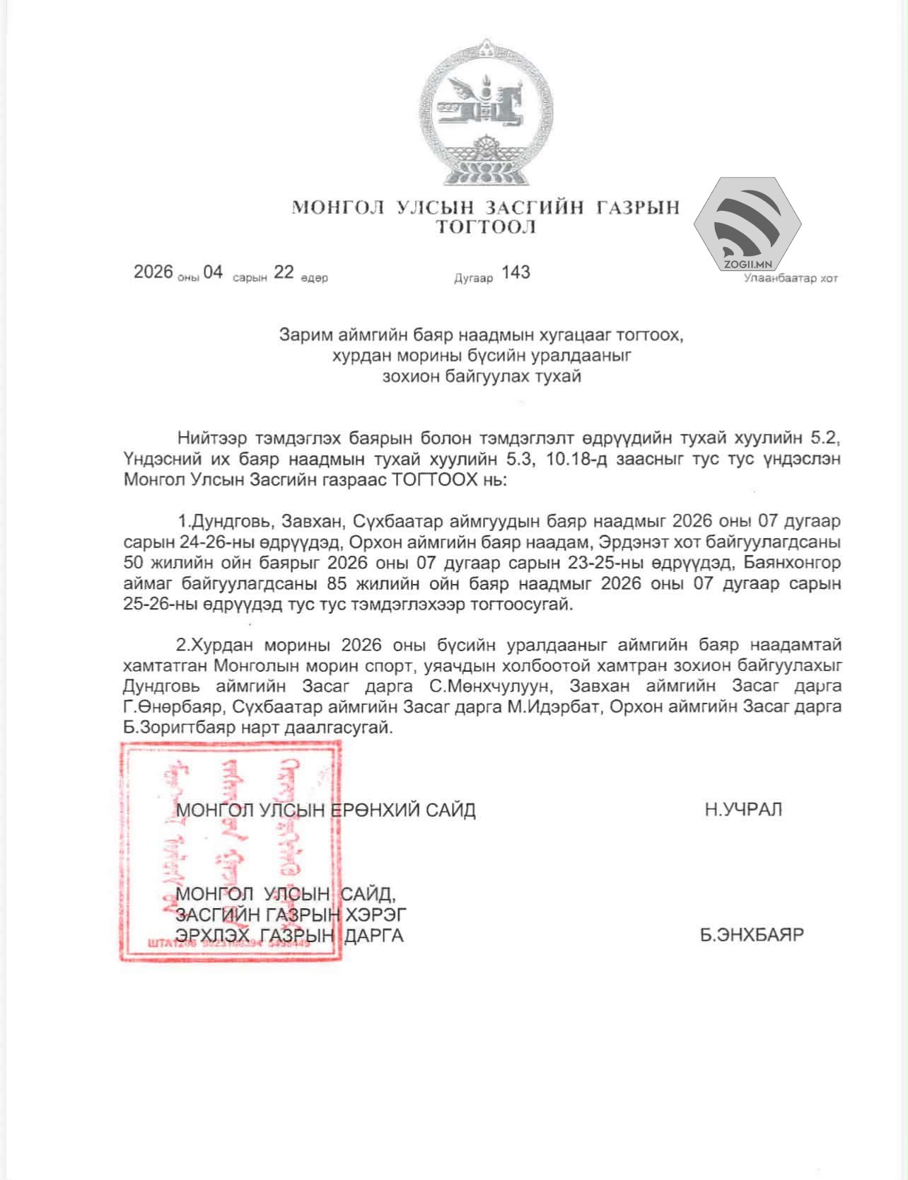 Засгийн газрын 143 дугаар тогтоолын дагуу зарим аймгийн баяр наадмын хугацааг баталж, хурдан морины бүсийн уралдааныг зохион байгуулах шийдвэр гарлаа.
