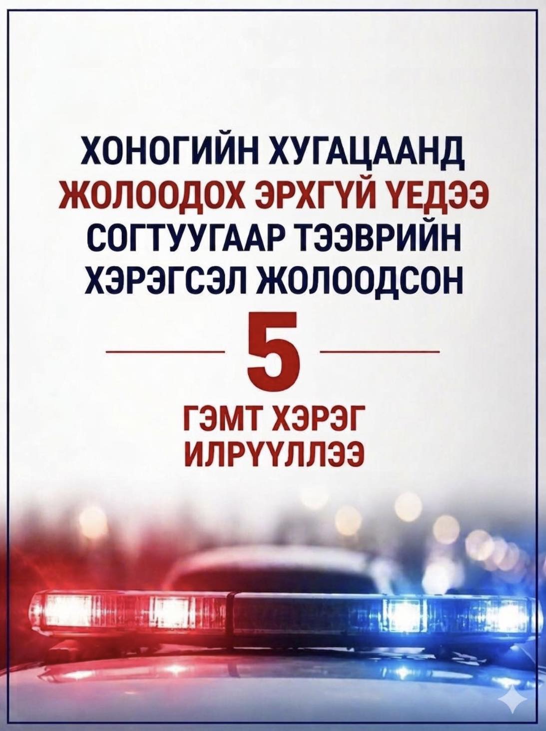 Хоногийн хугацаанд /2026.04.28/ тээврийн хэрэгсэл жолоодох эрх хасагдсан үедээ согтуугаар тээврийн хэрэгсэл жолоодсон 5 гэмт хэргийг илрүүллээ.