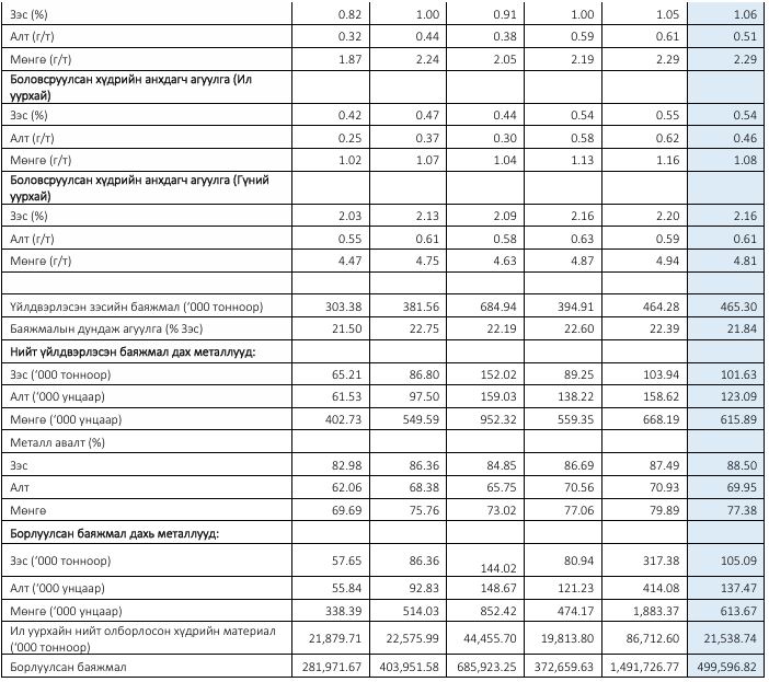 - Оны эхний улиралд гүний уурхайн зэс болон алтны үйлдвэрлэл шинэ дээд амжилт тогтоон, баяжмал дахь алт болон зэсийн үйлдвэрлэлээ тус бүр 10% гаруйгаар давуулан биелүүллээ.