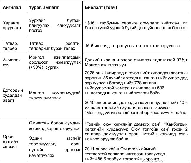 - 2026 оны нэгдүгээр улиралд үндэсний компаниудтай хийсэн худалдан авалт, бусад хамтын ажиллагаа, төсөвт төлж буй татвар, хураамж, үндсэн ажилчдын цалинд 4 их наяд төгрөг дотоодод зарцуулжээ. Энэ нь Оюу толгойн үйл ажиллагааны үр өгөөжөөр өдөр бүр 43.3 тэрбум төгрөг Монгол Улсын эдийн засгийн эргэлтэд орсон гэсэн үг юм.
