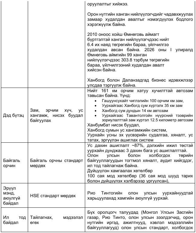 - “Ханбогдын хөгжлийн хурдасгуур Оюу толгойн сан”‑ийн үйл ажиллагааны хүрээнд Ханбогд сумын хөгжлийн бодлого, төлөвлөлтийг уялдуулах, орон нутгийн эдийн засгийг дэмжих чиглэлээр бодитой ажлууд 2026 оны эхний улиралд хийгдлээ. Ханбогд сумын хөгжлийн Түншлэлийн хорооны VIII хурлаар хот байгуулалт, газар зохион байгуулалт, сумын 2026 оны хөгжлийн төлөвлөгөө, гурван бүсийн хэсэгчилсэн ерөнхий төлөвлөгөө, Хурдасгуур сангийн жилийн төлөвлөгөө, хөрөнгө оруулалтын зарцуулалтын асуудлуудыг хэлэлцэж, цаашдын хамтын ажиллагааг өргөжүүлэхэд санал нэгдсэн юм.