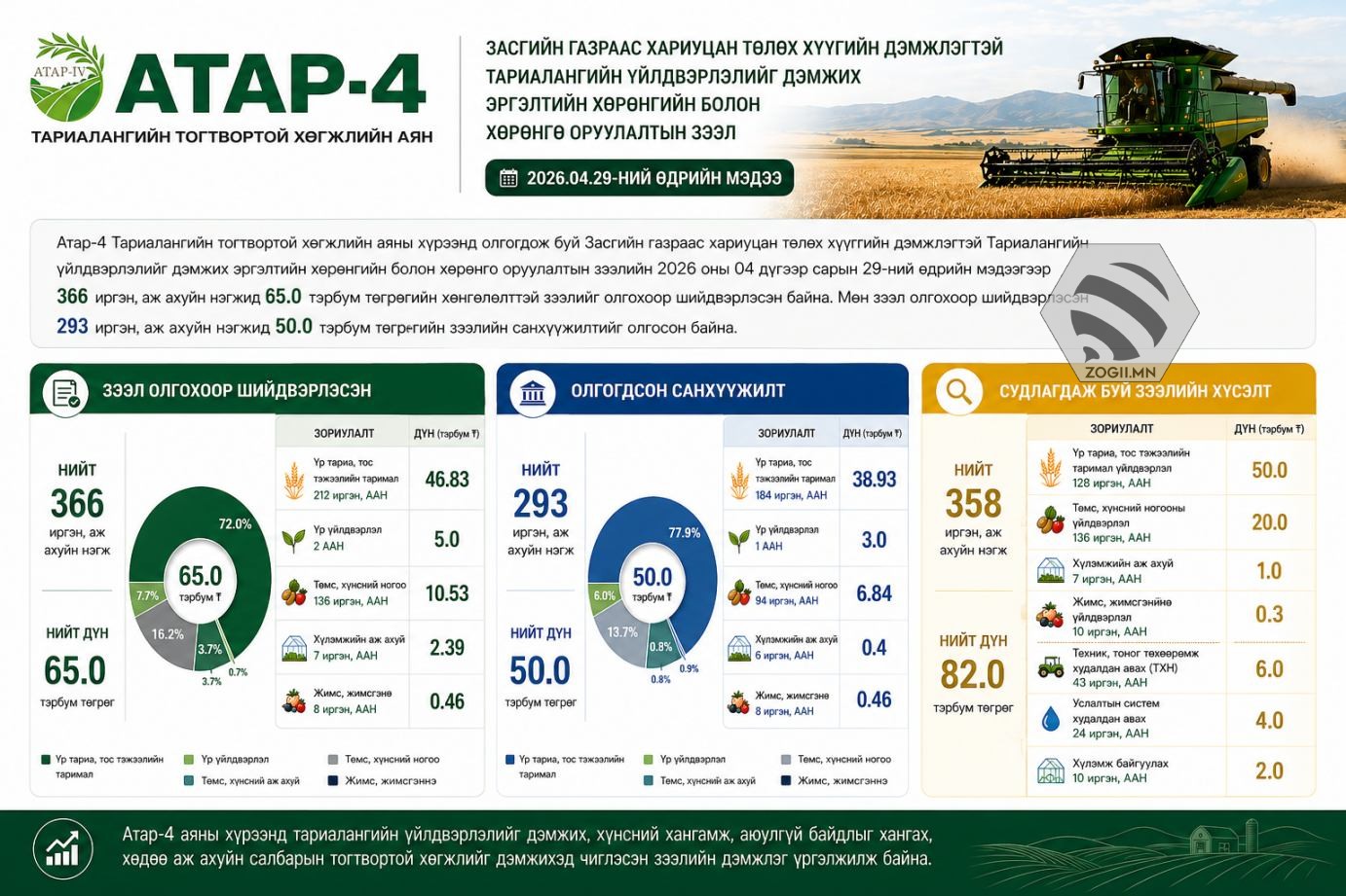 “Атар-4 Тариалангийн тогтвортой хөгжлийн аян"-ы хүрээнд олгогдож буй Засгийн газраас хариуцан төлөх хүүгийн дэмжлэгтэй тариалангийн үйлдвэрлэлийг дэмжих эргэлтийн хөрөнгийн болон хөрөнгө оруулалтын зээлийн 2026 оны 04 дүгээр сарын 29-ний өдрийн мэдээгээр: