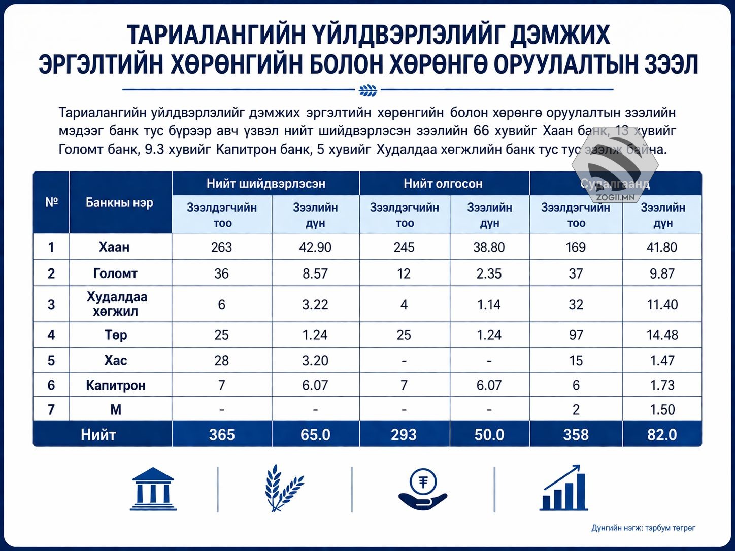 - Жимс жимсгэнийн үйлдвэрлэл эрхлэгч 8 иргэн, аж ахуйн нэгжид 0.46 тэрбум төгрөгийн зээлийн санхүүжилтийг тус тус олгосон байна.