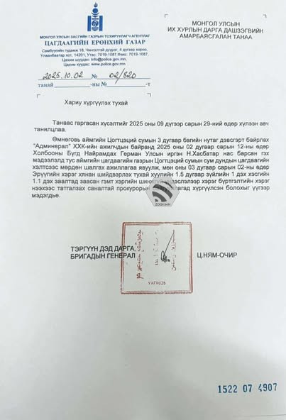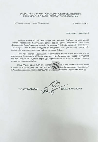 Уг бичигт ЦЕГ-ын тэргүүн дэд дарга, бригадын генерал Ц.Ням-Очир: ХБНГУ-ын иргэн Н.Хасбатар нас барсан мэдээлэлд мөрдөн шалгах ажиллагаа явуулаад, гэмт хэргийн шинжгүй үндэслэлээр хэрэг бүртгэлтийн хэрэг нээхээс татгалзах саналтай прокурорын байгууллагад хүргүүлсэн болохыг үүгээр мэдэгдье… гэжээ.
