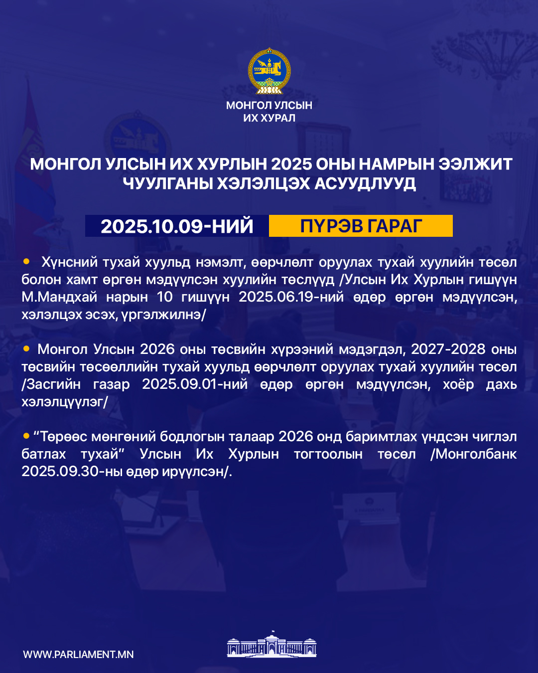 Улсын Их Хурлын 2025 оны намрын ээлжит чуулганы өнөөдрийн /2025.10.09/ хуралдаанаар хэлэлцэх асуудлуудыг танилцуулж байна.