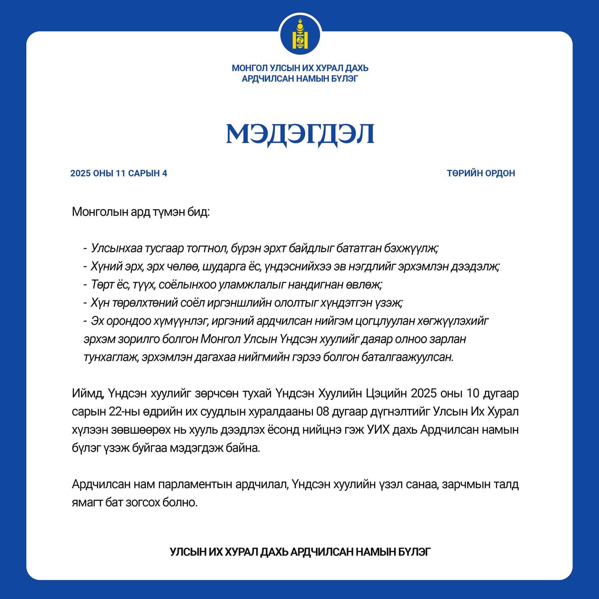 Иймд, Үндсэн хуулийг зөрчсөн тухай Үндсэн Хуулийн Цэцийн 2025 оны 10 дугаар сарын 22-ны өдрийн их суудлын хуралдааны 08 дугаар дүгнэлтийг Улсын Их Хурал хүлээн зөвшөөрөх нь хууль дээдлэх ёсонд нийцнэ гэж УИХ дахь Ардчилсан намын бүлэг үзэж буйгаа мэдэгдэж байна. Ардчилсан нам парламентын ардчилал, Үндсэн хуулийн үзэл санаа, зарчмын талд ямагт бат зогсох болно" гэжээ.