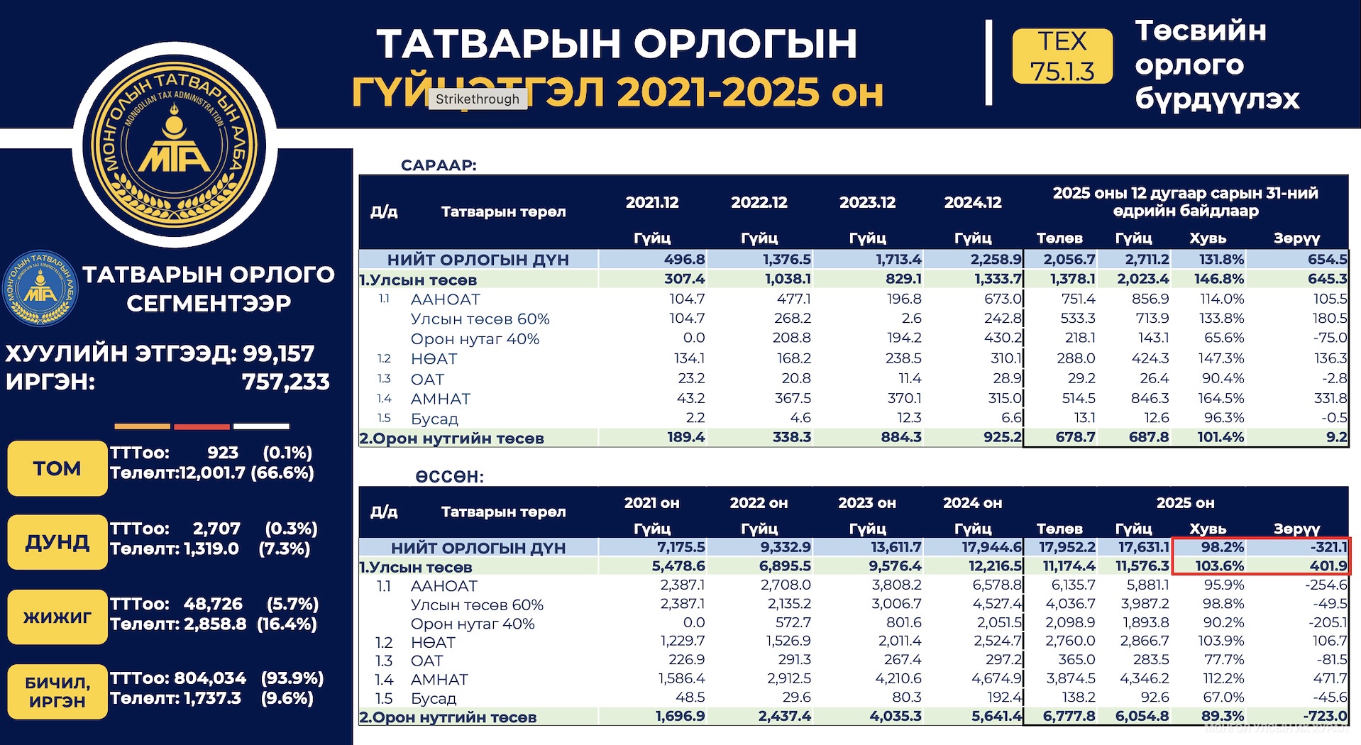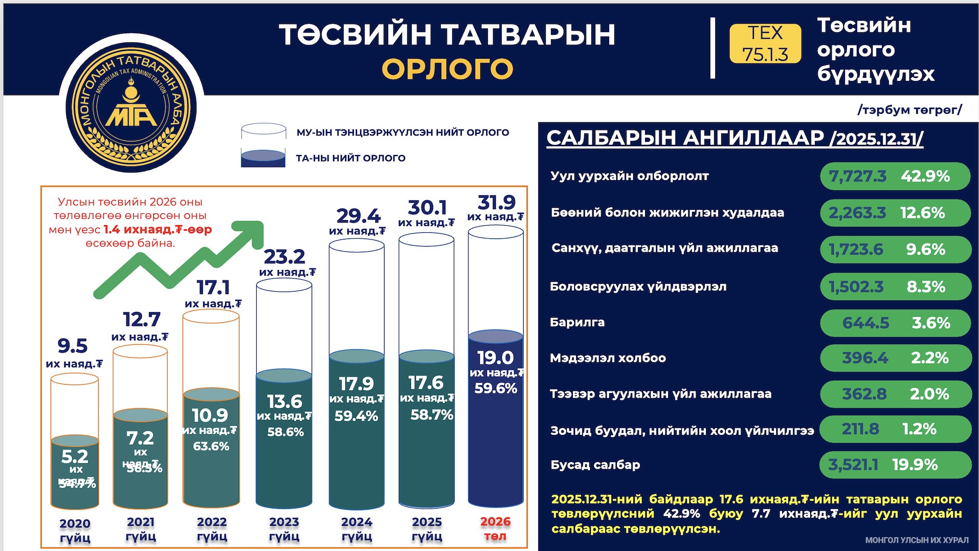 Татварын ерөнхий газар 2025 онд “Зөвлөн туслагч татварын алба” гэсэн зорилтыг тавьж ажилласан бол энэ жил “Хэрэгцээнд нь үндэслэсэн зөвлөгч алба” зорилтын хүрээнд ажиллаж байгаа аж. Монгол Улсад өнөөдрийн байдлаар нийт 286 мянган татвар төлөгч аж ахуйн нэгж, хуулийн этгээд, 2.5 сая иргэн татвар төлөгчөийн бүртгэлтэй байгаа аж.