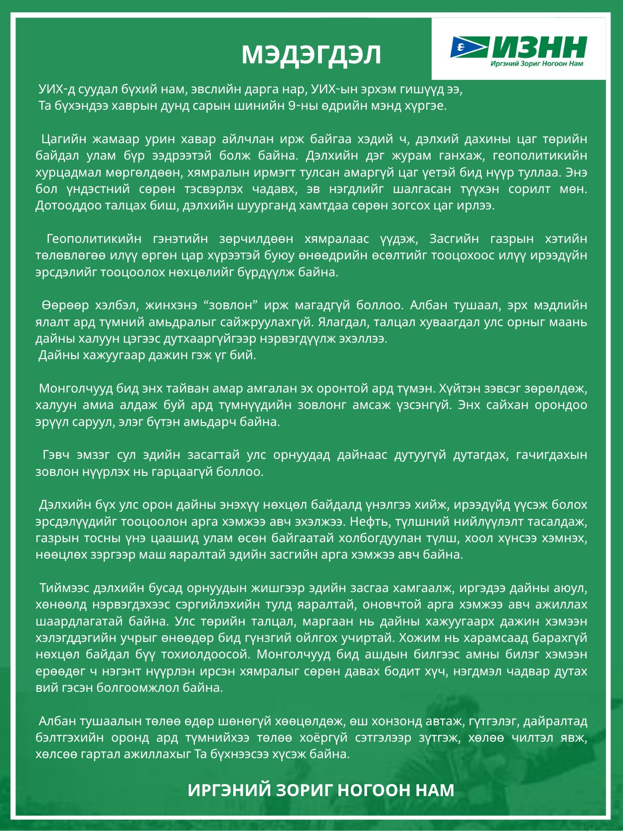 ИЗНН-аас мэдэгдэл гаргалаа.
