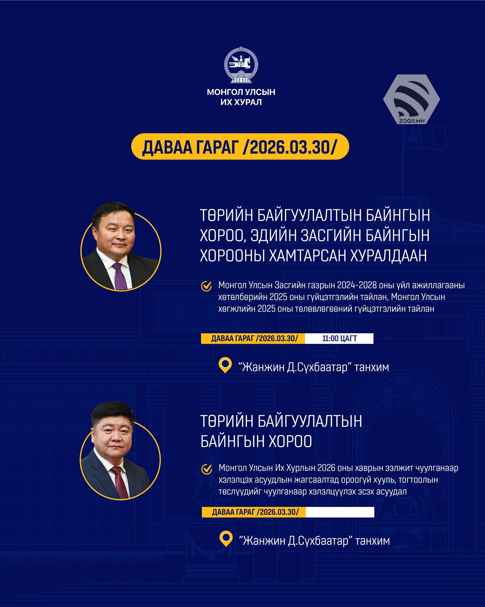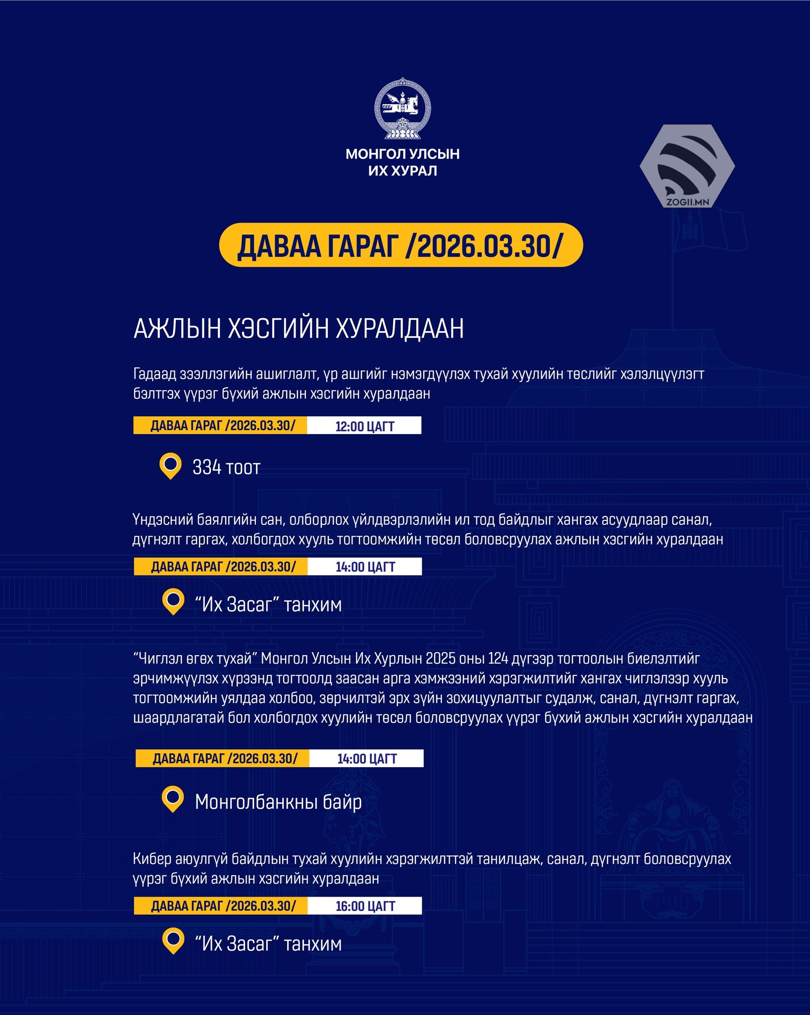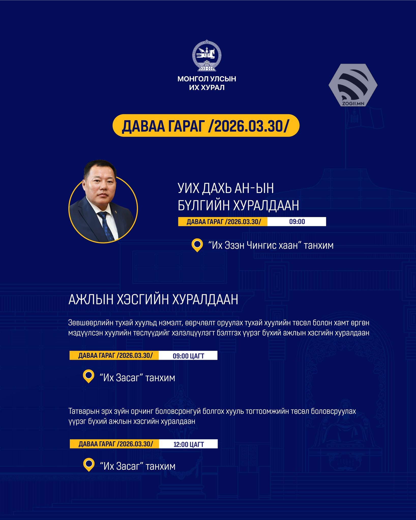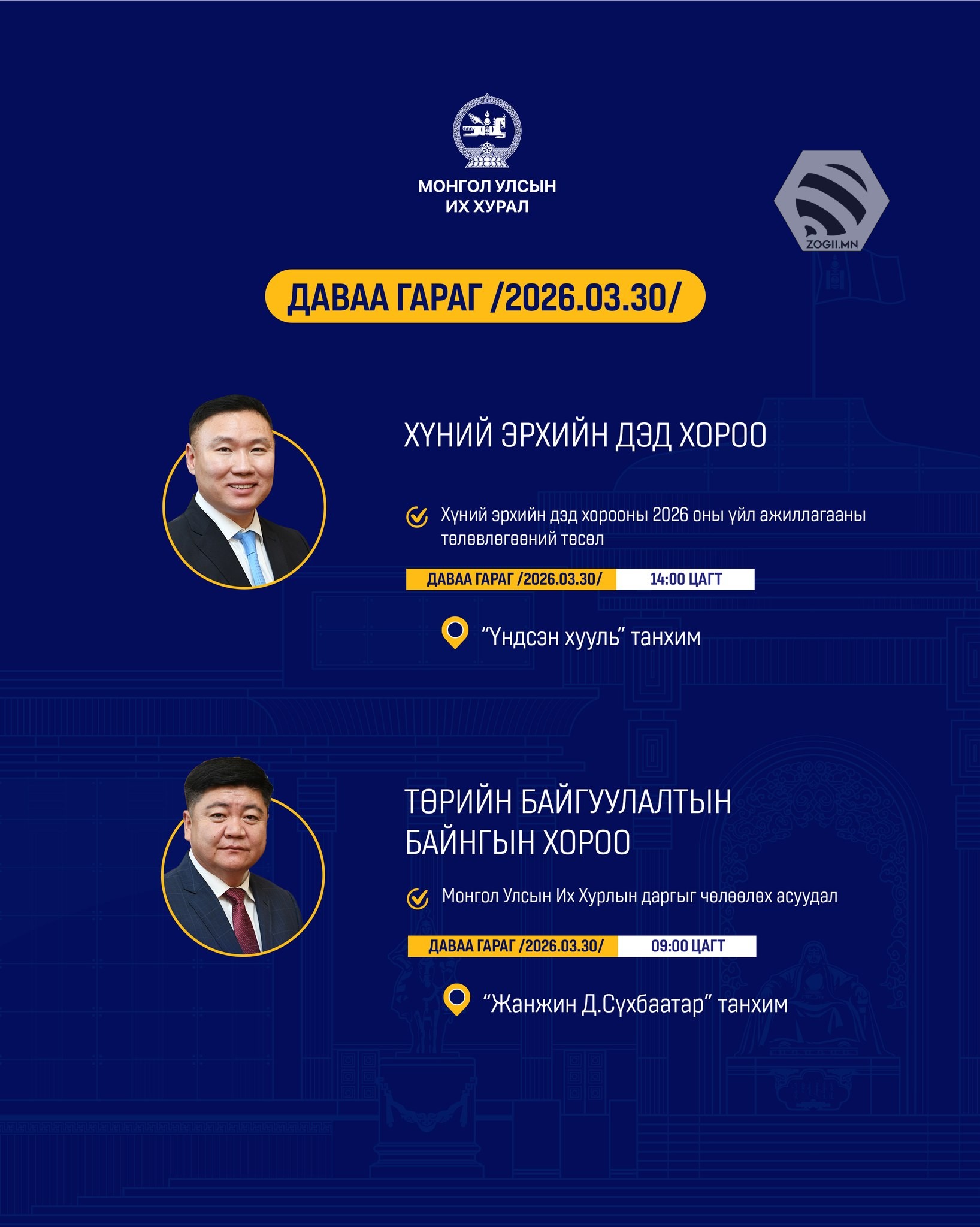 Өнөөдөр (2026.03.30) УИХ-ын чуулган, Байнгын хороо, Ажлын хэсгүүдийн хуралдаанаар хэлэлцэх асуудлууд