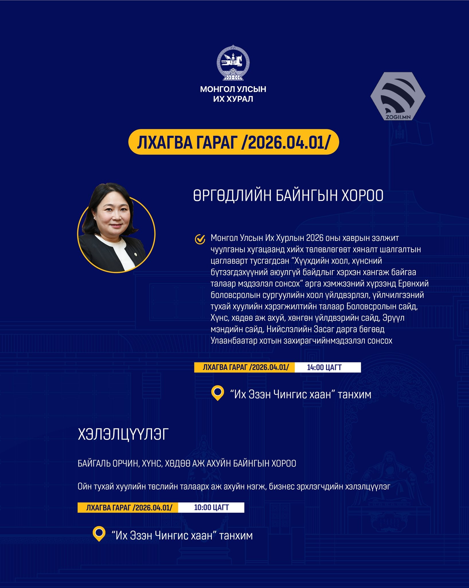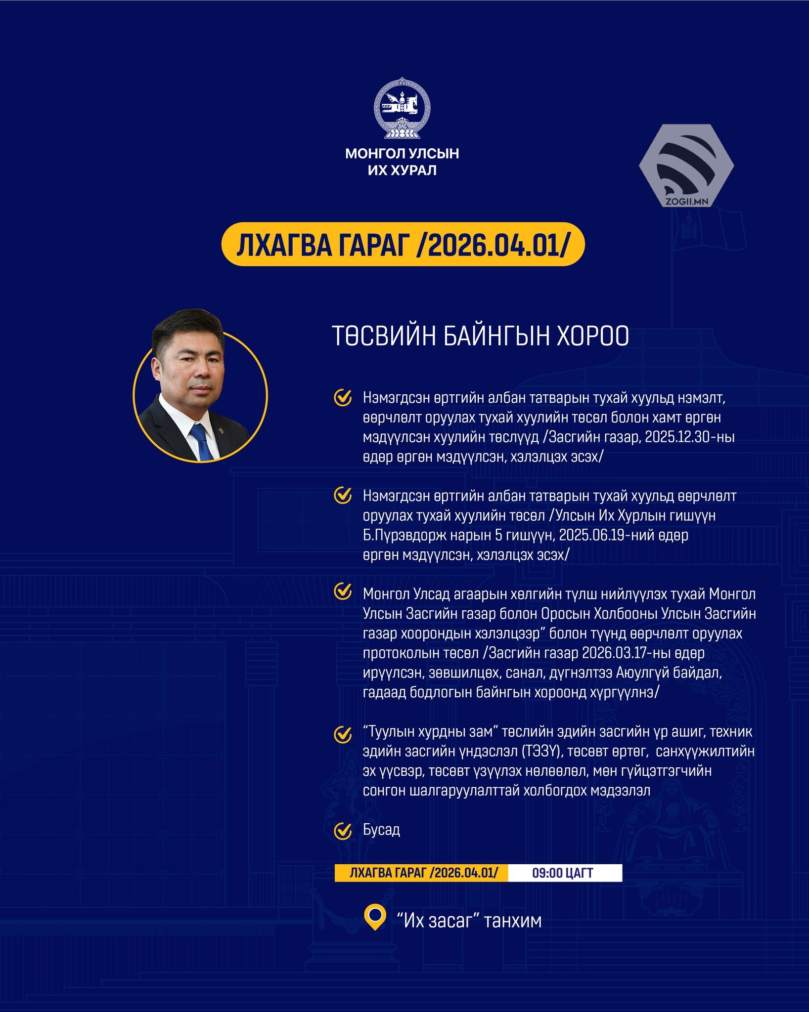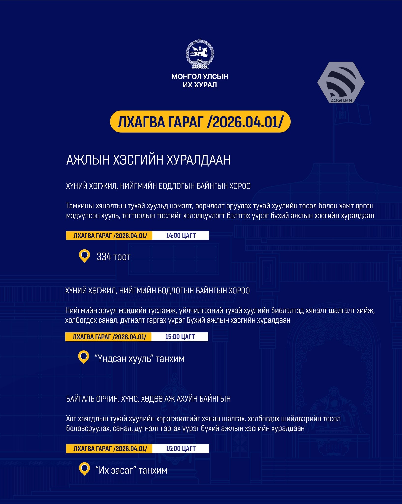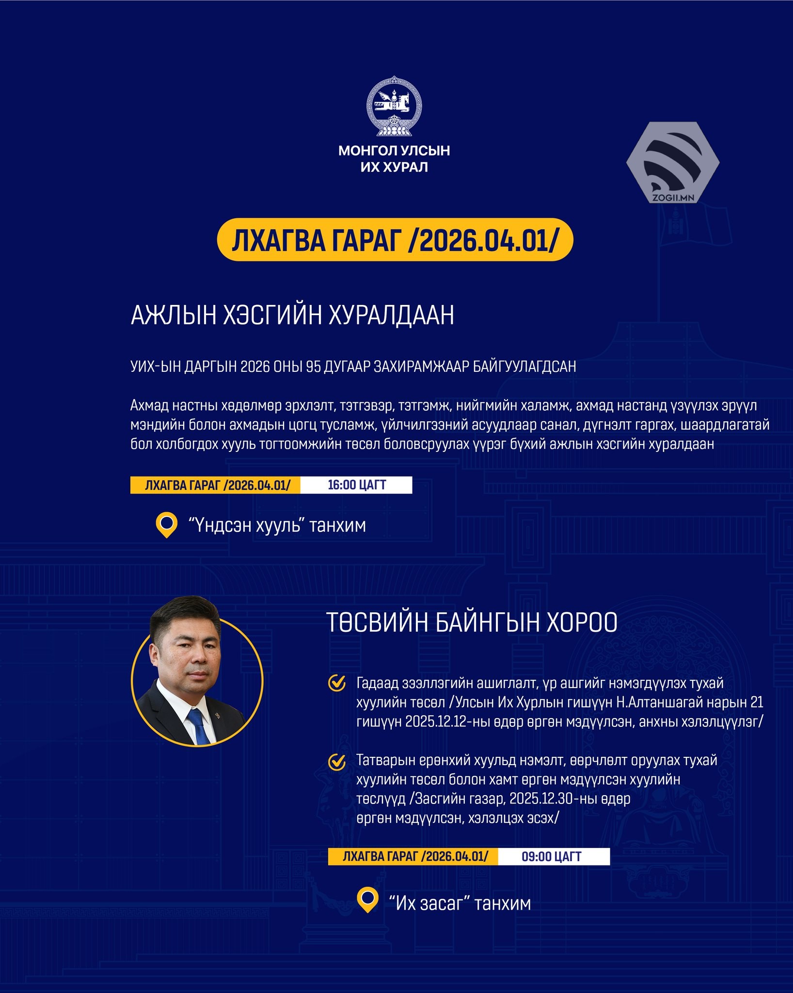 Өнөөдөр (2026.04.01) УИХ-ын Байнгын хороо, Ажлын хэсгүүдийн хуралдаанаар хэлэлцэх асуудлуудийг танилцуулж байна.