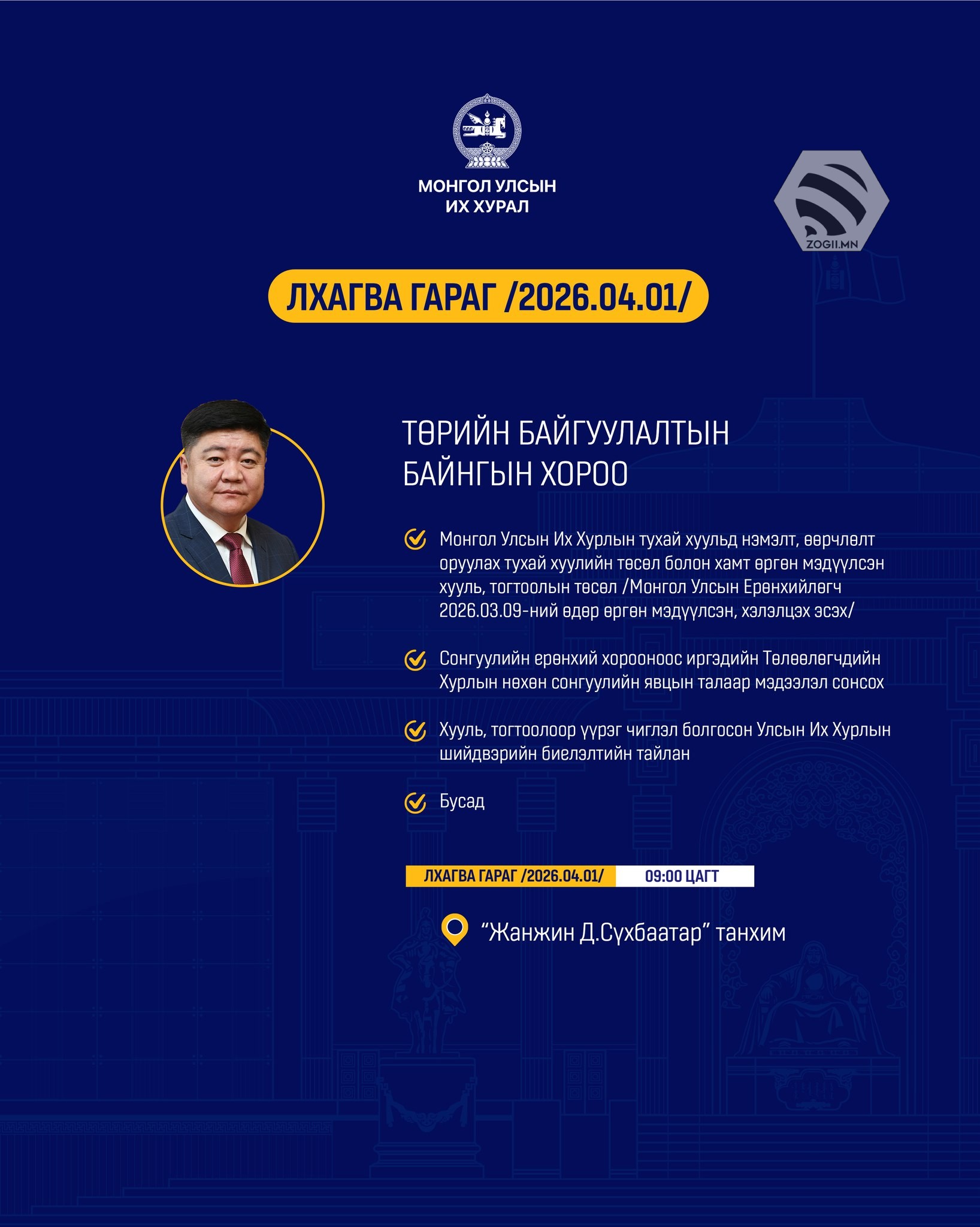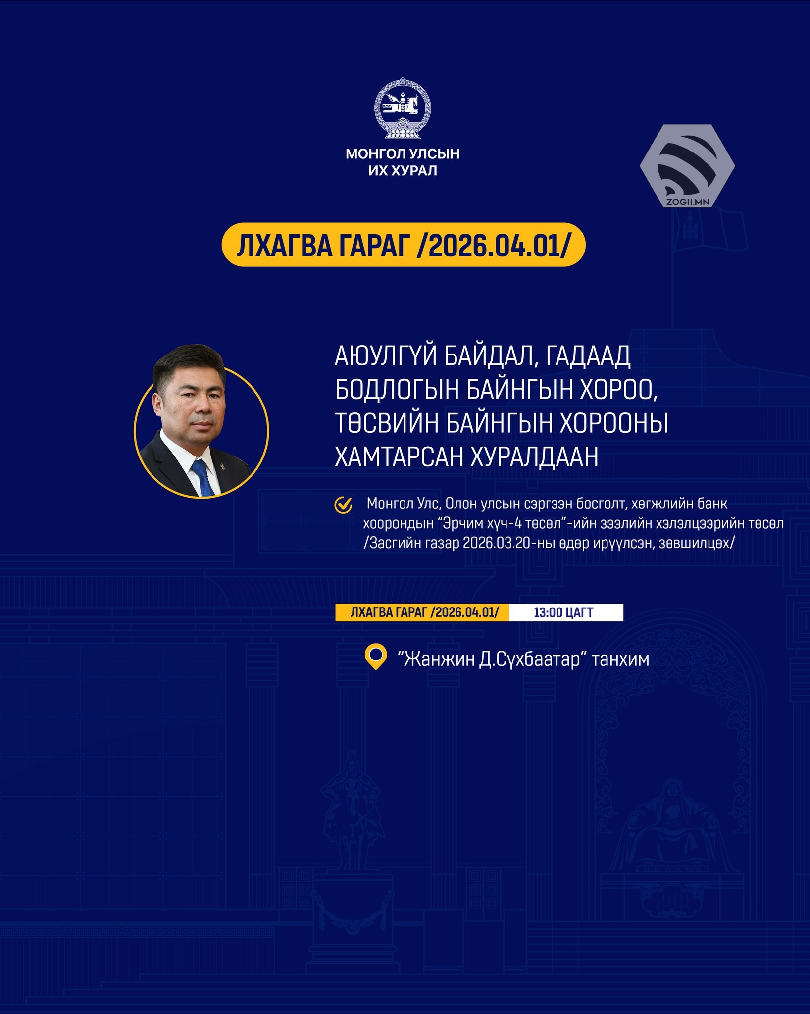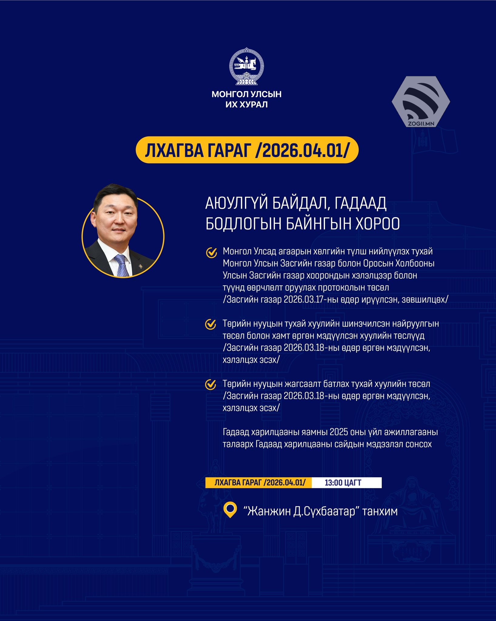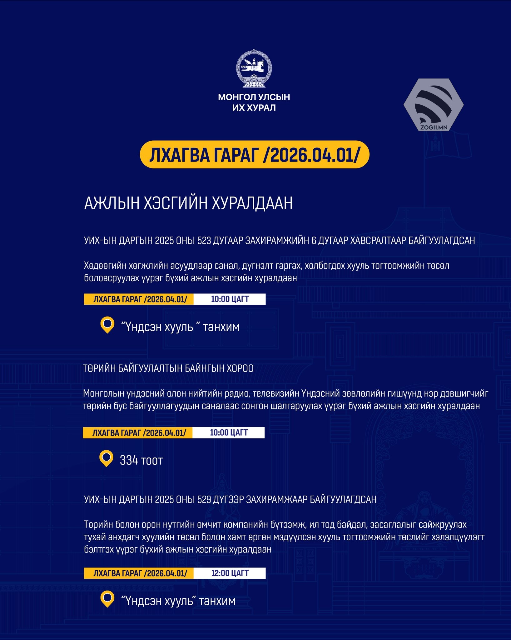 Өнөөдөр (2026.04.01) УИХ-ын Байнгын хороо, Ажлын хэсгүүдийн хуралдаанаар хэлэлцэх асуудлуудийг танилцуулж байна.