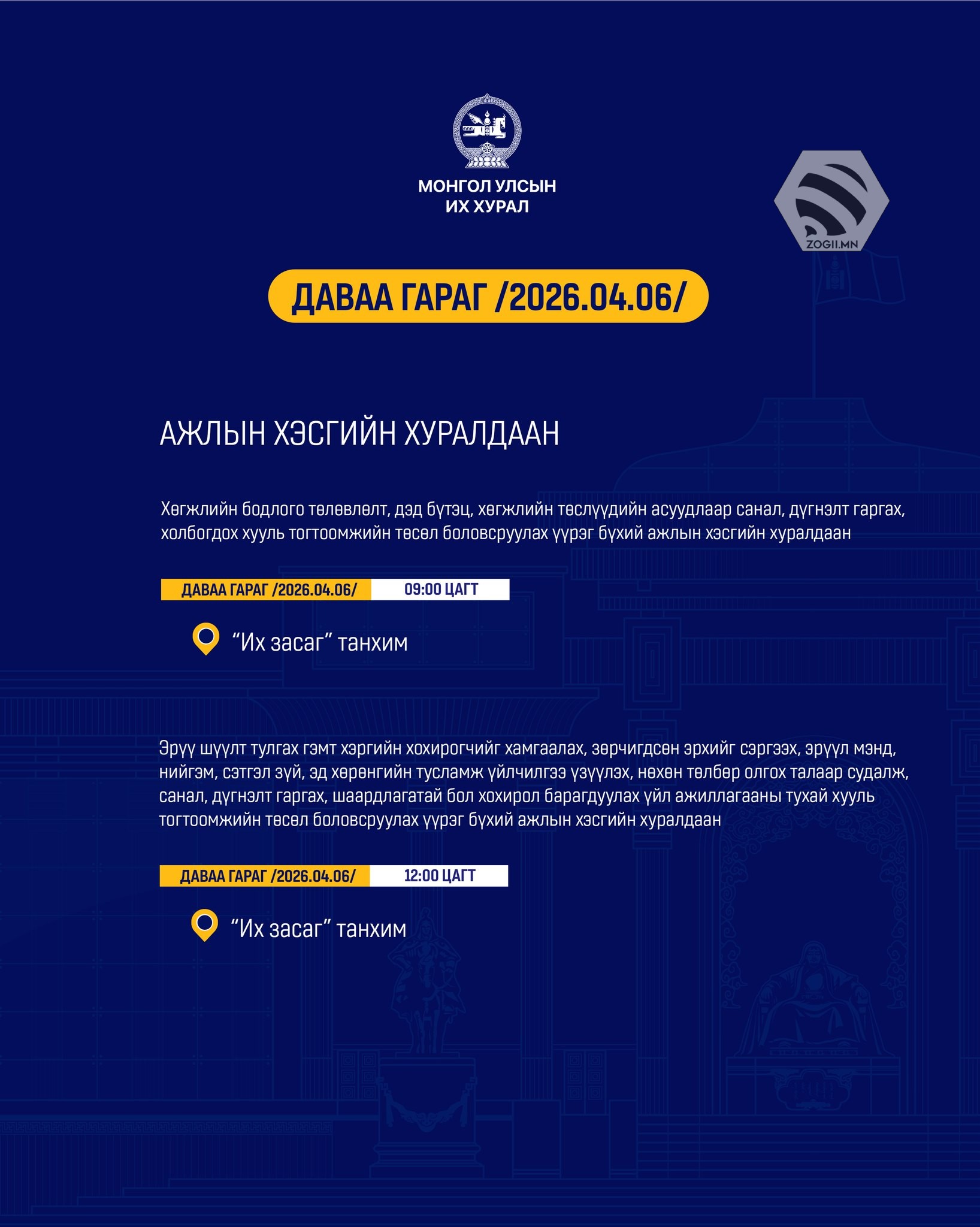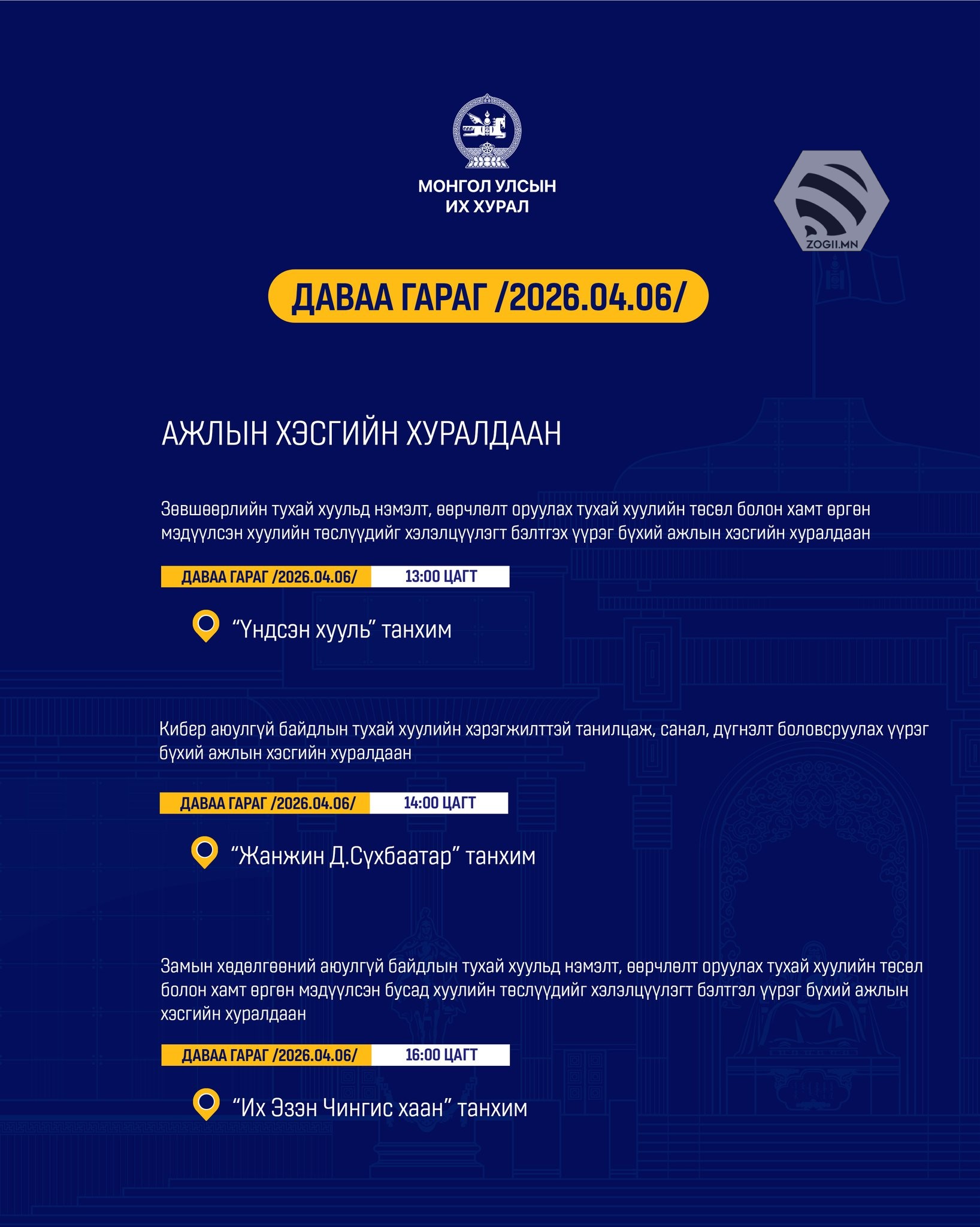 Өнөөдөр (2026.04.06) УИХ дахь намын бүлэг, зөвлөл болон Ажлын хэсгүүдийн хуралдаанаар хэлэлцэх асуудлуудыг танилцуулж байна.
