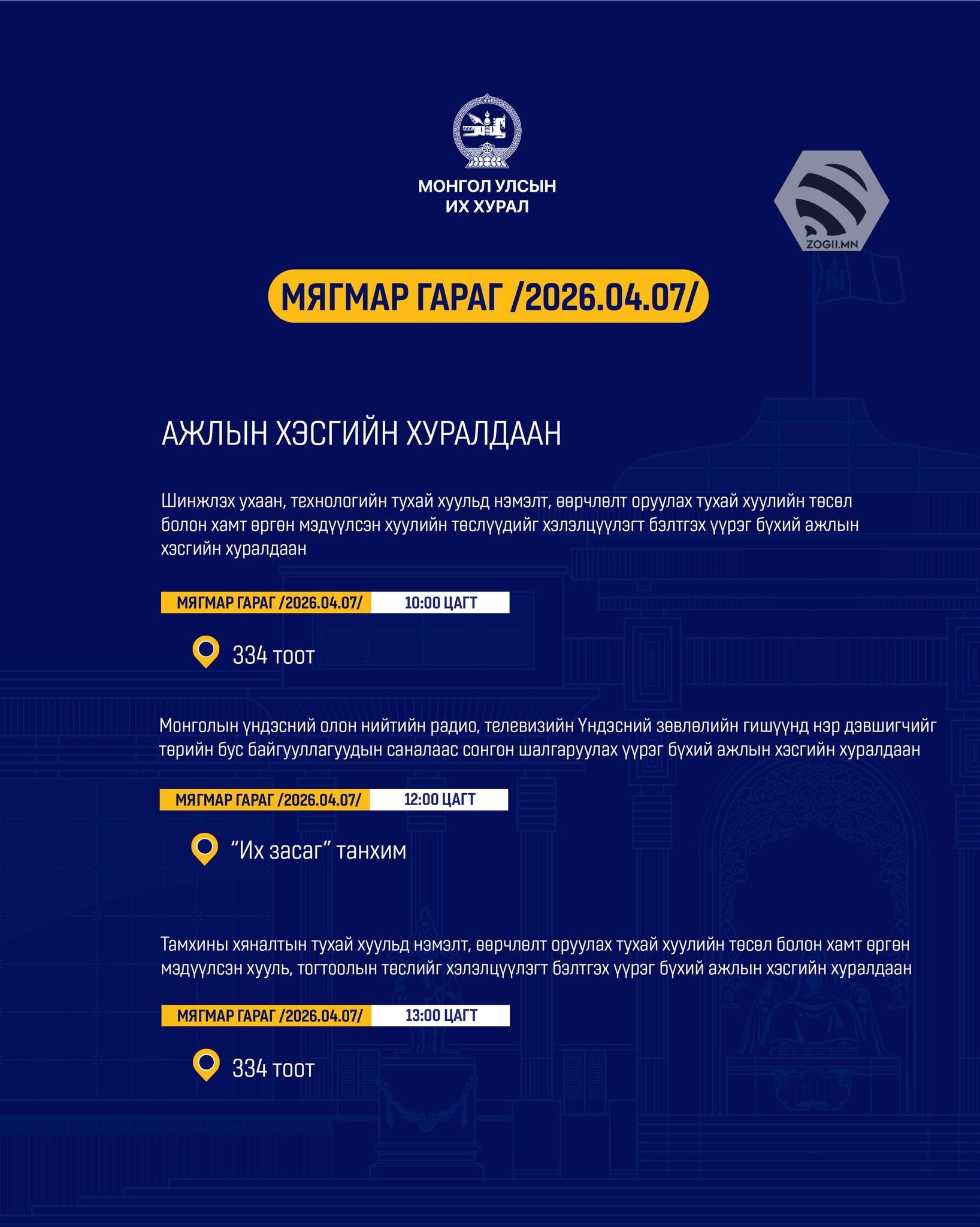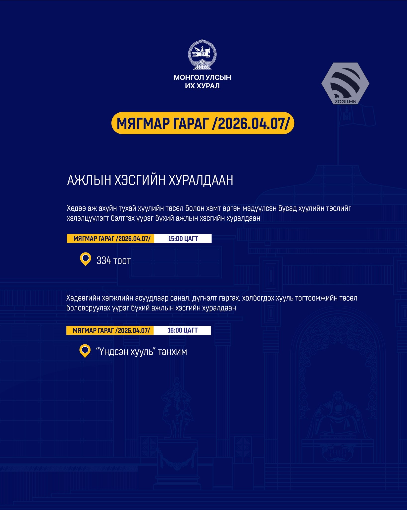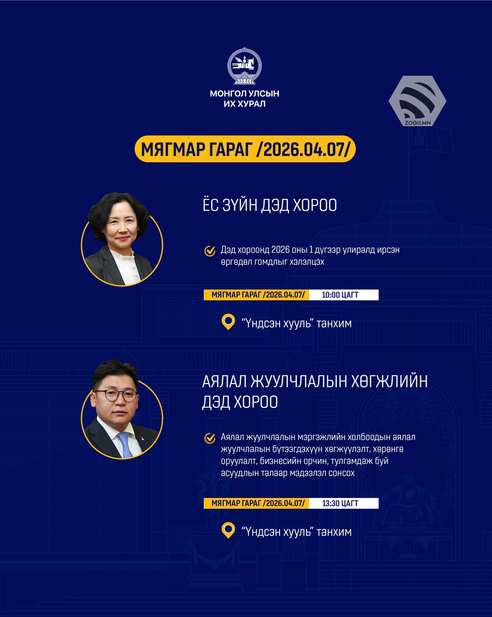 Өнөөдөр (2026.04.07) УИХ-ын Байнгын хороо, Дэд хороо, Ажлын хэсгүүдийн хуралдаанаар хэлэлцэх асуудлуудыг танилцуулж байна.