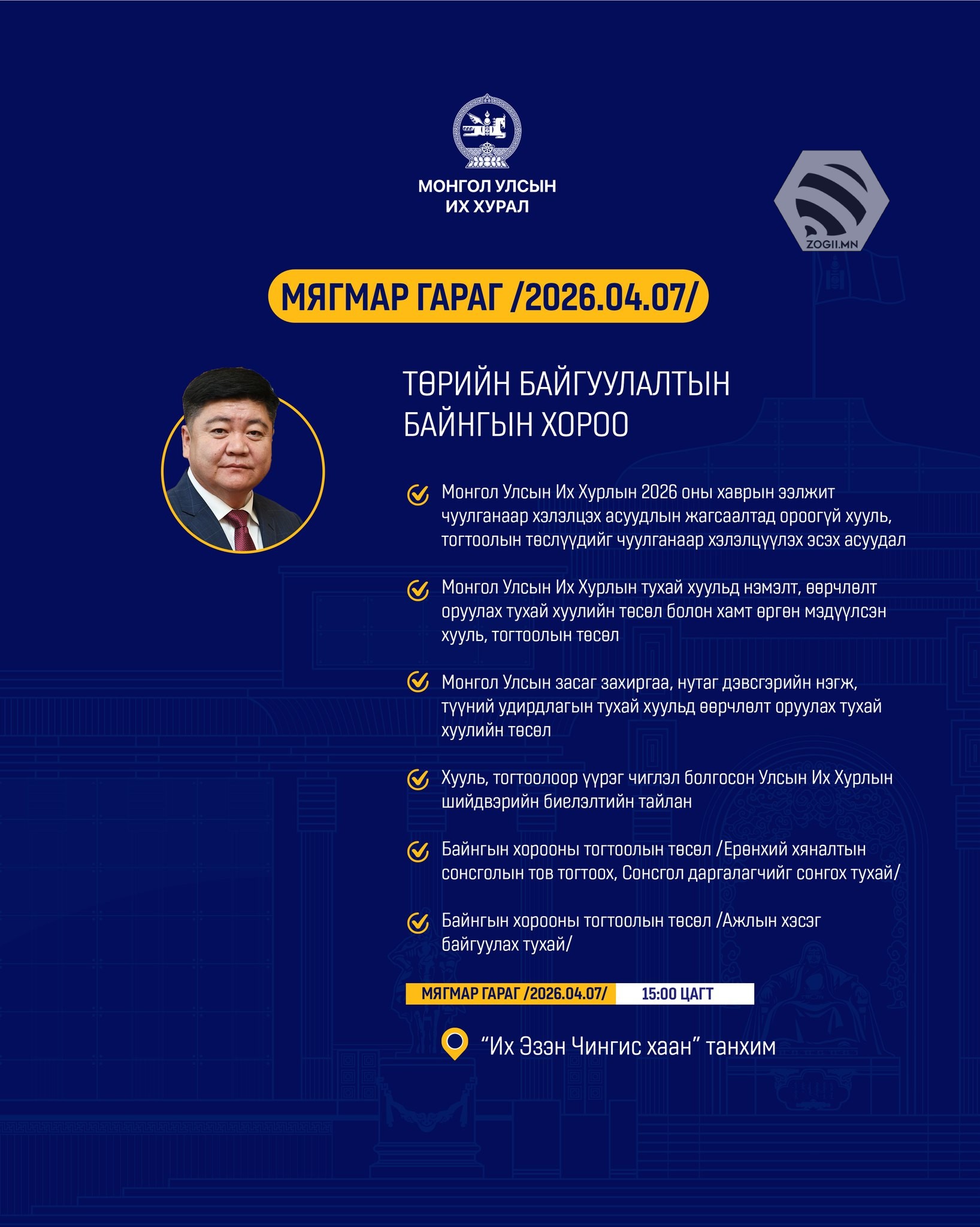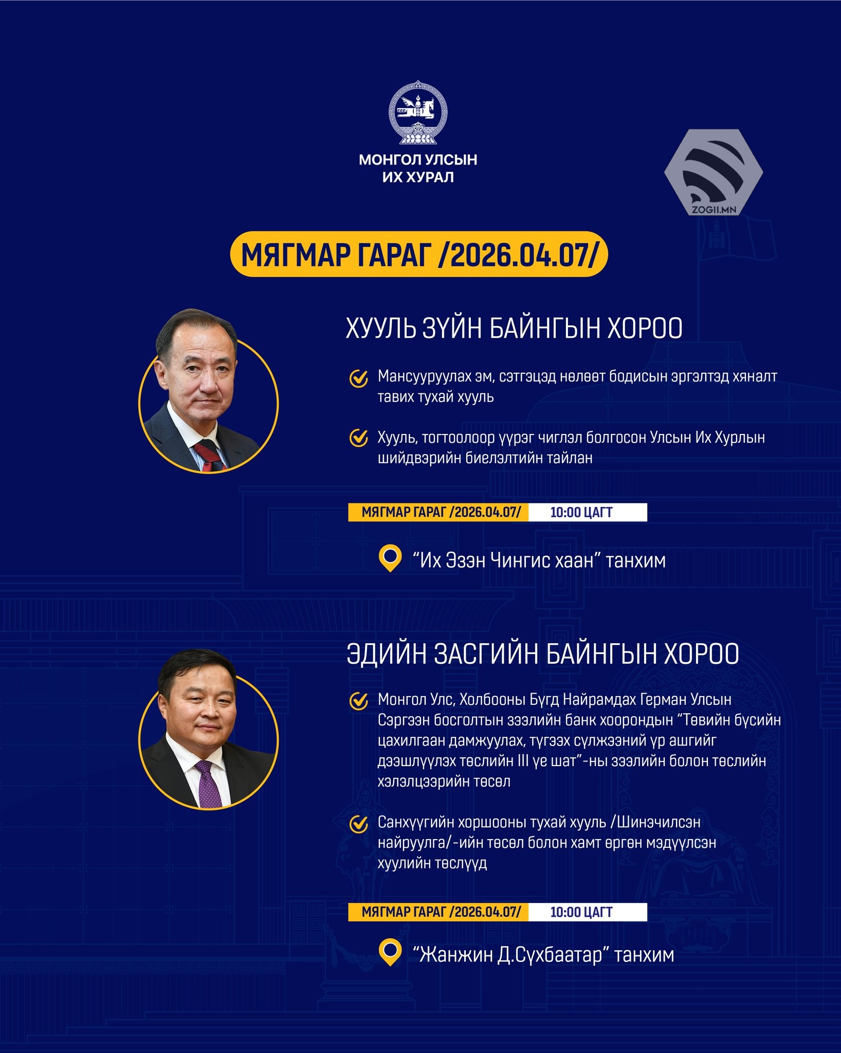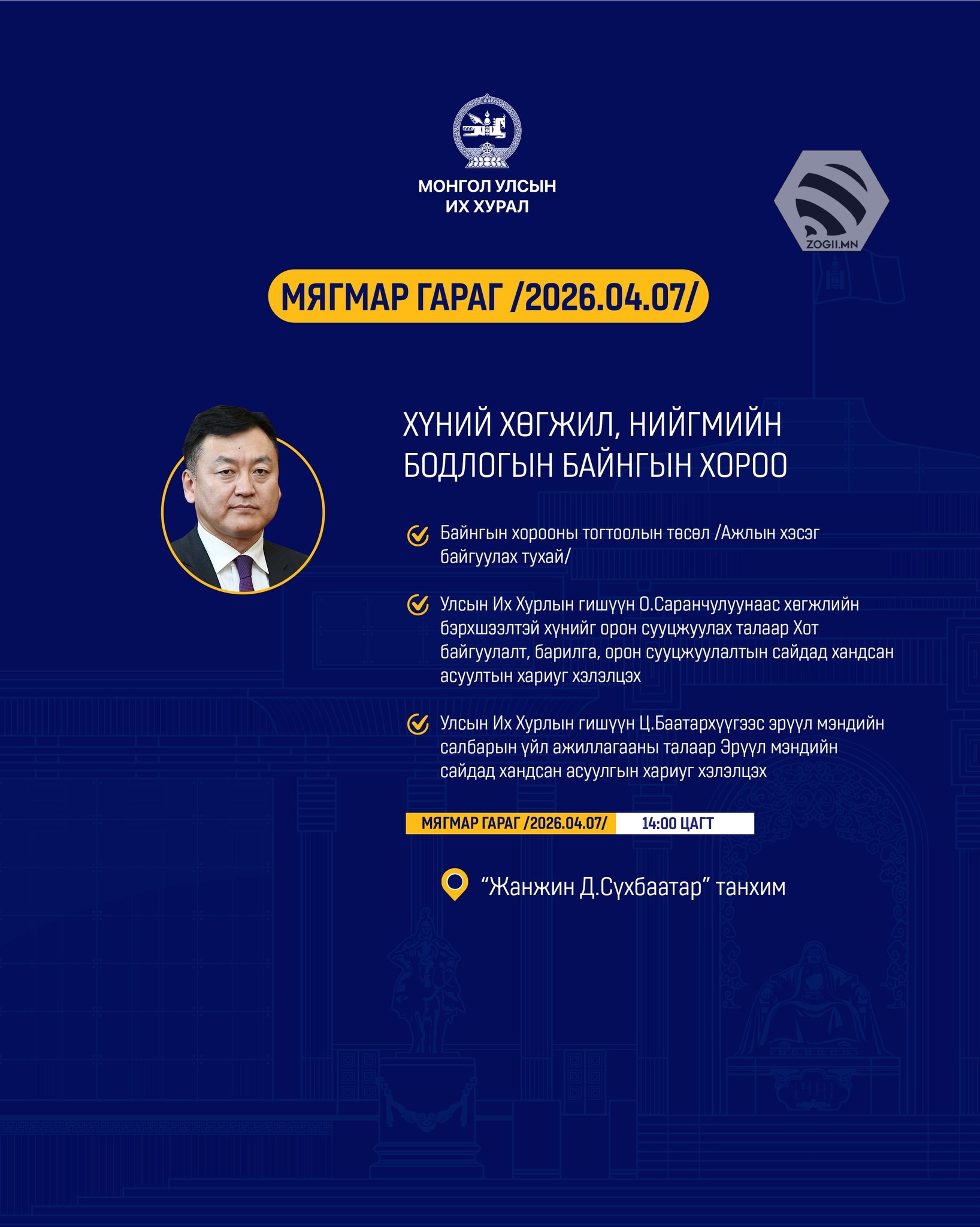 Өнөөдөр (2026.04.07) УИХ-ын Байнгын хороо, Дэд хороо, Ажлын хэсгүүдийн хуралдаанаар хэлэлцэх асуудлуудыг танилцуулж байна.